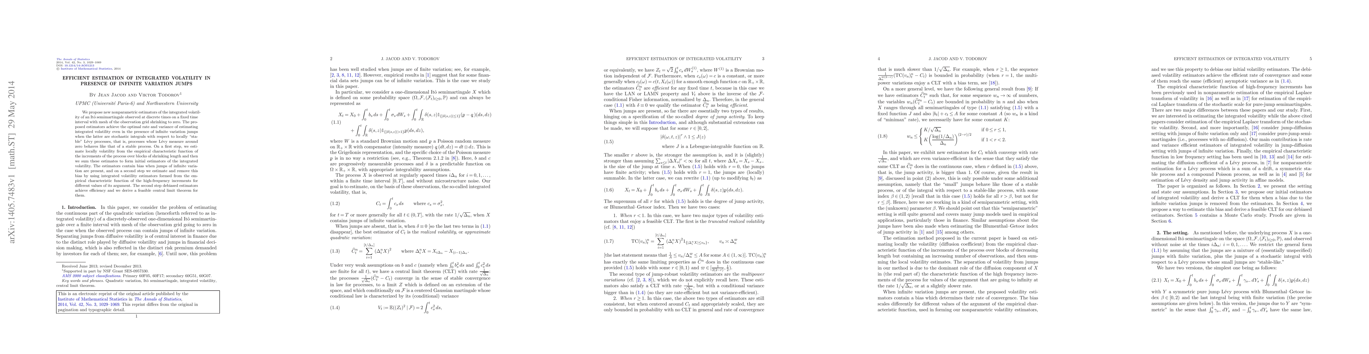 This paper proposes new nonparametric estimators for integrated volatility in Itô semimartingales, achieving optimal rates even with infinite variation jumps. The method involves estimating local volatility from empirical characteristic functions and then debiasing to account for jumps, resulting in efficient estimators with a derived central limit theorem.