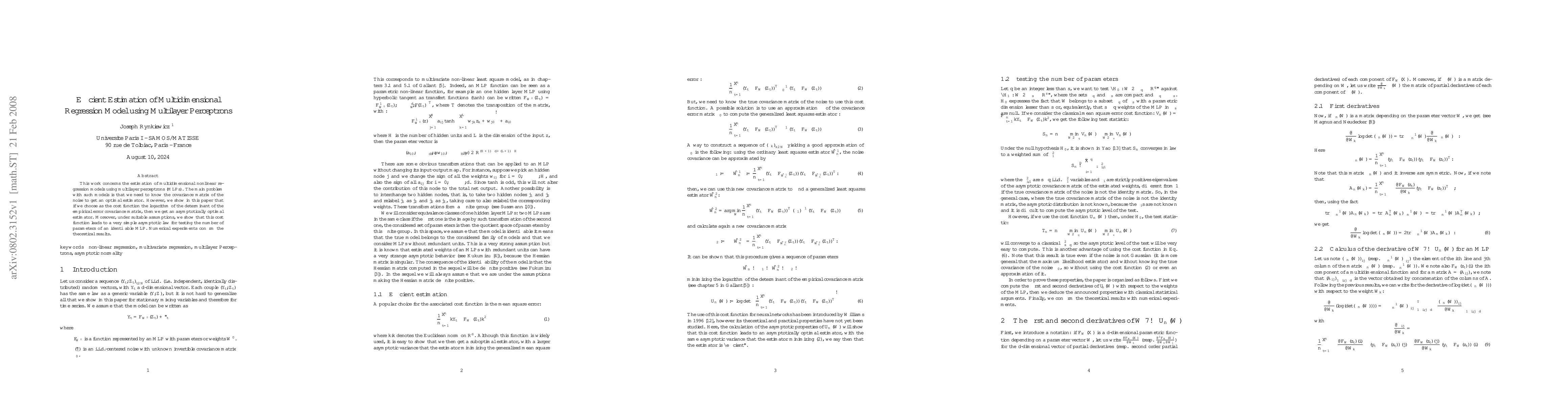 This work concerns the estimation of multidimensional nonlinear regression models using multilayer perceptrons (MLPs). The main problem with such models is that we need to know the covariance matrix of the noise to get an optimal estimator. However, we show in this paper that if we choose as the cost function the logarithm of the determinant of the empirical error covariance matrix, then we get an asymptotically optimal estimator. Moreover, under suitable assumptions, we show that this cost function leads to a very simple asymptotic law for testing the number of parameters of an identifiable MLP. Numerical experiments confirm the theoretical results.