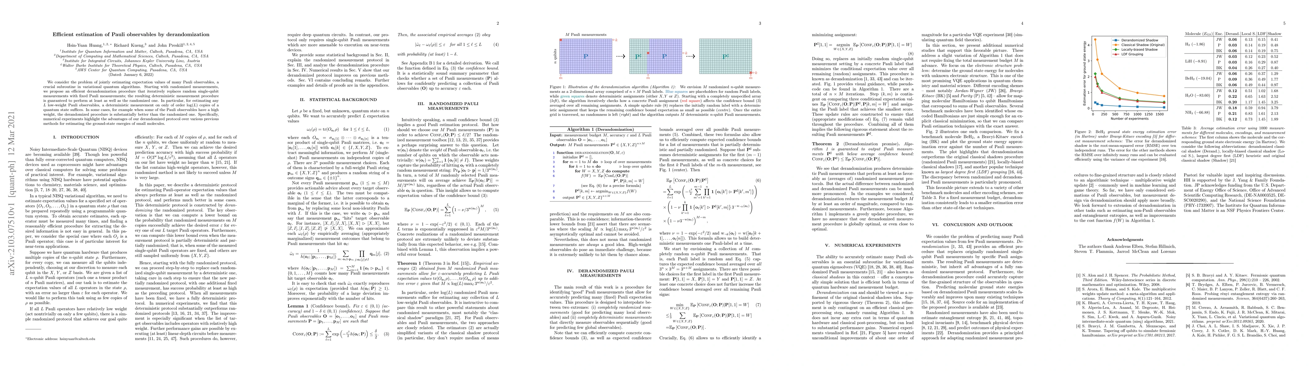 We consider the problem of jointly estimating expectation values of many Pauli observables, a crucial subroutine in variational quantum algorithms. Starting with randomized measurements, we propose an efficient derandomization procedure that iteratively replaces random single-qubit measurements with fixed Pauli measurements; the resulting deterministic measurement procedure is guaranteed to perform at least as well as the randomized one. In particular, for estimating any $L$ low-weight Pauli observables, a deterministic measurement on only of order $\log(L)$ copies of a quantum state suffices. In some cases, for example when some of the Pauli observables have a high weight, the derandomized procedure is substantially better than the randomized one. Specifically, numerical experiments highlight the advantages of our derandomized protocol over various previous methods for estimating the ground-state energies of small molecules.