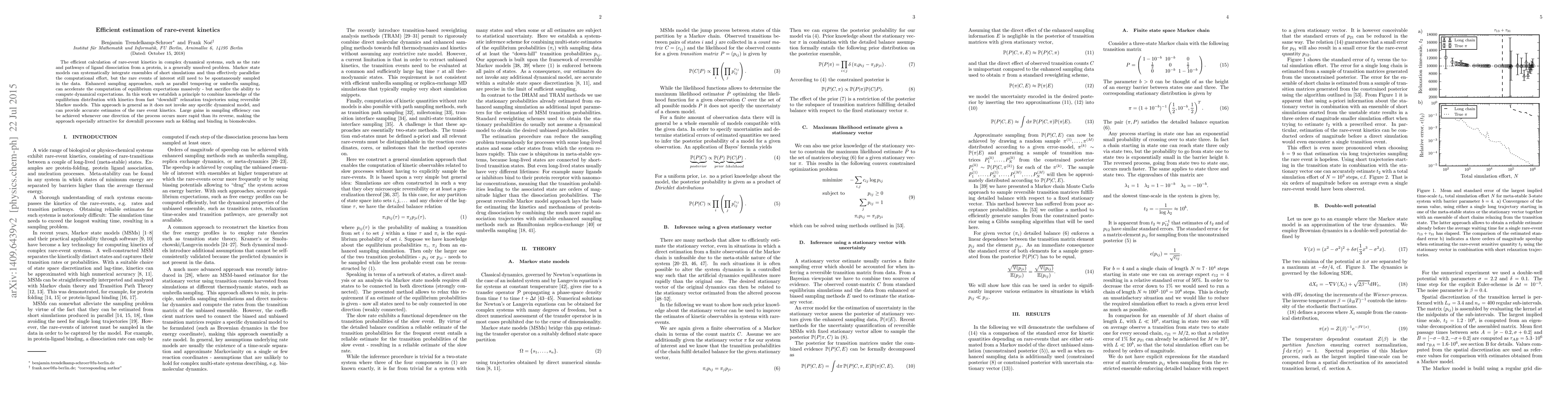This paper proposes a method to efficiently estimate rare-event kinetics in complex systems by combining equilibrium distribution knowledge with fast downhill relaxation trajectories using reversible Markov models. This general approach enhances sampling efficiency, especially for processes like protein folding and ligand binding where one direction is faster than the reverse.