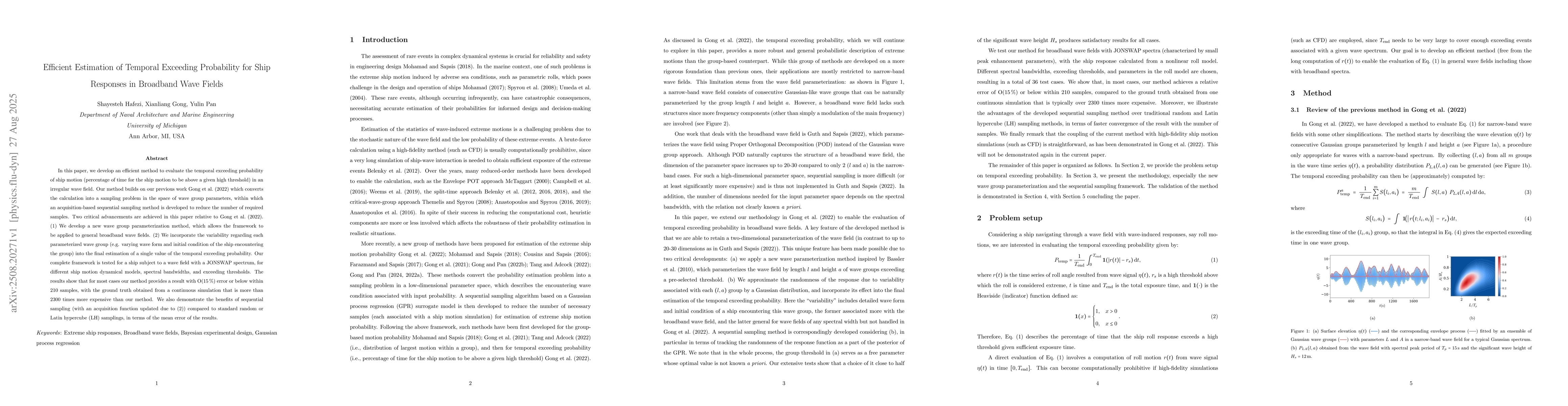 In this paper, we develop an efficient method to evaluate the temporal exceeding probability of ship motion (percentage of time for the ship motion to be above a given high threshold) in an irregular wave field. Our method builds on our previous work of Gong et al. (Applied Ocean Research, 2022), which converts the calculation into a sampling problem in the space of wave group parameters, within which an acquisition-based sequential sampling method is developed to reduce the number of required samples. Two critical advancements are achieved in this paper relative to that work. (1) We develop a new wave group parameterization method, which allows the framework to be applied to general broadband wave fields. (2) We incorporate the variability regarding each parameterized wave group (e.g. varying wave form and initial condition of the ship encountering the group) into the final estimation of a single value of the temporal exceeding probability. Our complete framework is tested for a ship subject to a wave field with a JONSWAP spectrum, for different ship motion dynamical models, spectral bandwidths, and exceeding thresholds. The results show that for most cases our method provides a result with O(15%) error or below within 210 samples, with the ground truth obtained from a continuous simulation that is more than 2300 times more expensive than our method. We also demonstrate the benefits of sequential sampling (with an acquisition function updated due to (2)) compared to standard random or Latin hypercube (LH) samplings, in terms of the mean error of the results.