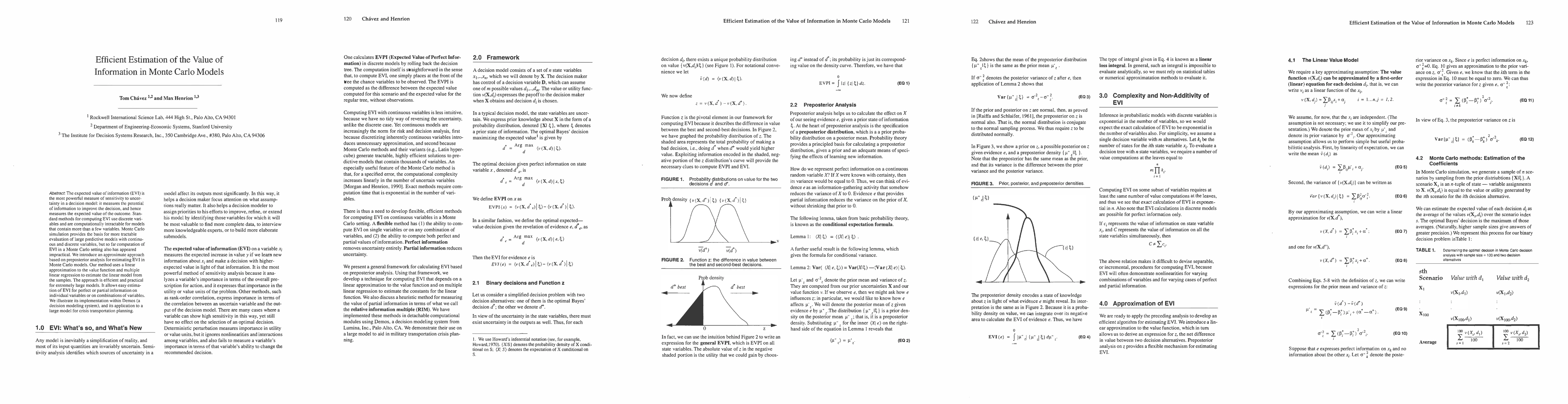 This paper introduces an efficient method for estimating the Expected Value of Information (EVI) in Monte Carlo models, utilizing a linear approximation and multiple linear regression for large predictive models. The proposed approach is practical for complex models and allows for easy estimation of EVI for both perfect and partial information on individual or combined variables.