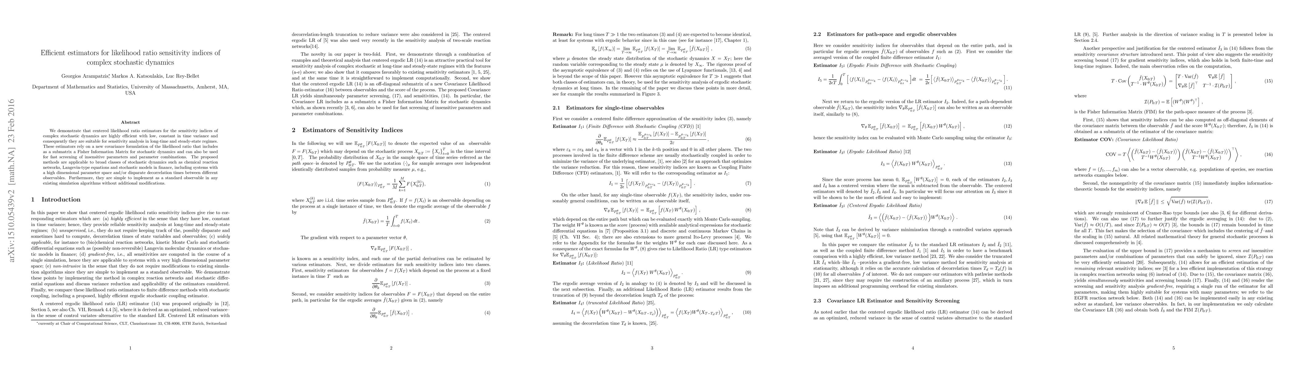 This paper proposes efficient centered likelihood ratio estimators for sensitivity indices in complex stochastic dynamics, showing low, constant variance over time. These estimators, based on a new covariance formulation including a Fisher Information Matrix, are suitable for long-time and steady-state sensitivity analyses and can be easily integrated into existing simulation algorithms.