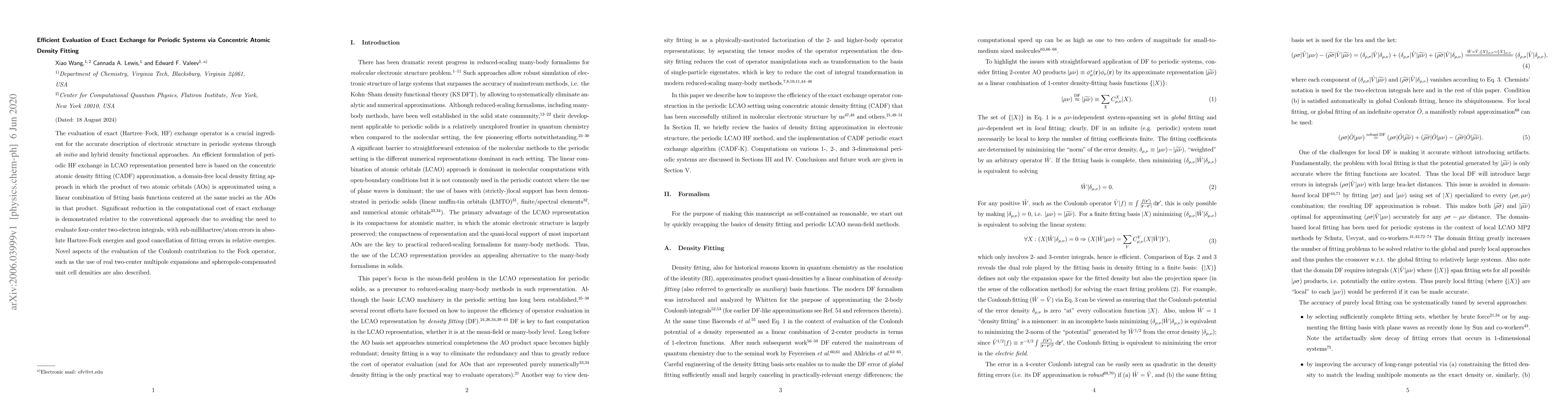 This paper presents an efficient method for evaluating exact exchange in periodic systems using concentric atomic density fitting, significantly reducing computational costs by avoiding four-center integrals, while maintaining accuracy with sub-millihartree/atom errors in absolute energies and good error cancellation in relative energies. The method also introduces real two-center multipole expansions and spheropole-compensated unit cell densities for the Coulomb contribution to the Fock operator.