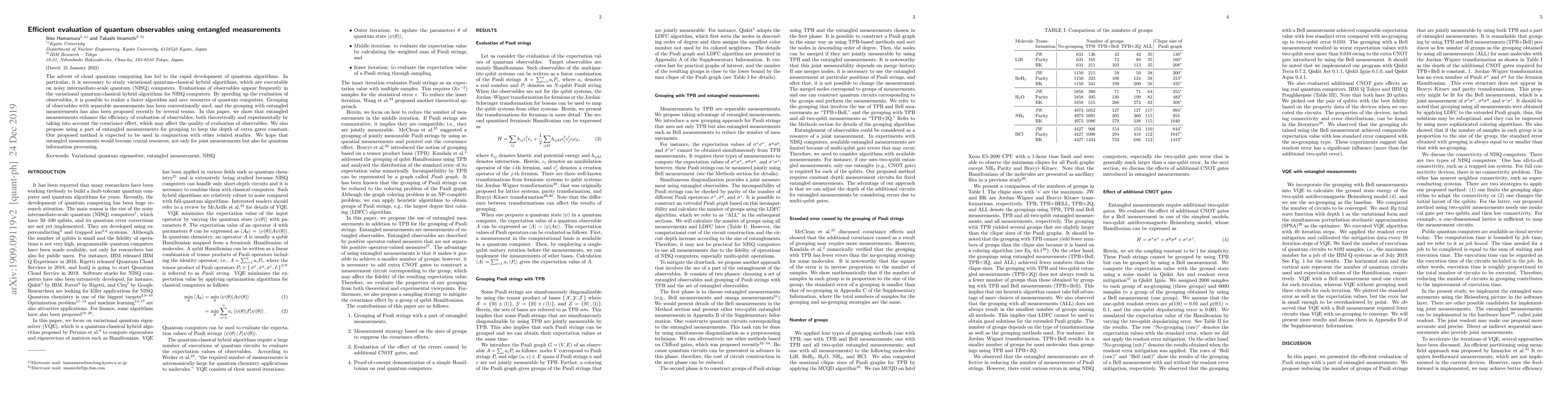 The paper proposes a method for efficient evaluation of quantum observables using entangled measurements, specifically Bell measurements, on NISQ computers. It compares this approach with traditional separable measurements and theoretical analysis, demonstrating improved efficiency through the consideration of covariance effects.