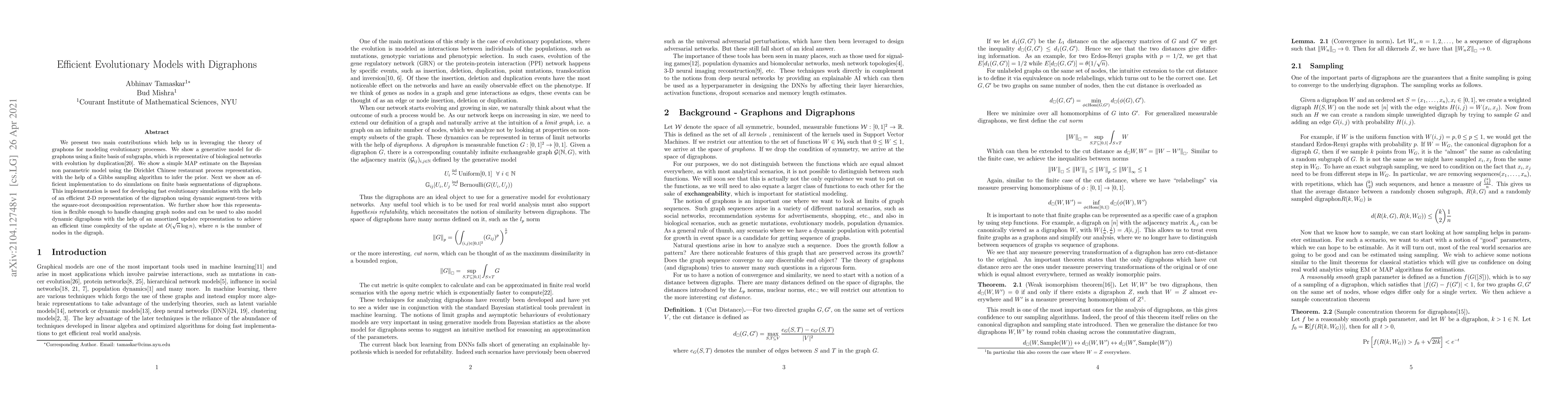 We present two main contributions which help us in leveraging the theory of graphons for modeling evolutionary processes. We show a generative model for digraphons using a finite basis of subgraphs, which is representative of biological networks with evolution by duplication. We show a simple MAP estimate on the Bayesian non parametric model using the Dirichlet Chinese restaurant process representation, with the help of a Gibbs sampling algorithm to infer the prior. Next we show an efficient implementation to do simulations on finite basis segmentations of digraphons. This implementation is used for developing fast evolutionary simulations with the help of an efficient 2-D representation of the digraphon using dynamic segment-trees with the square-root decomposition representation. We further show how this representation is flexible enough to handle changing graph nodes and can be used to also model dynamic digraphons with the help of an amortized update representation to achieve an efficient time complexity of the update at $O(\sqrt{|V|}\log{|V|})$.