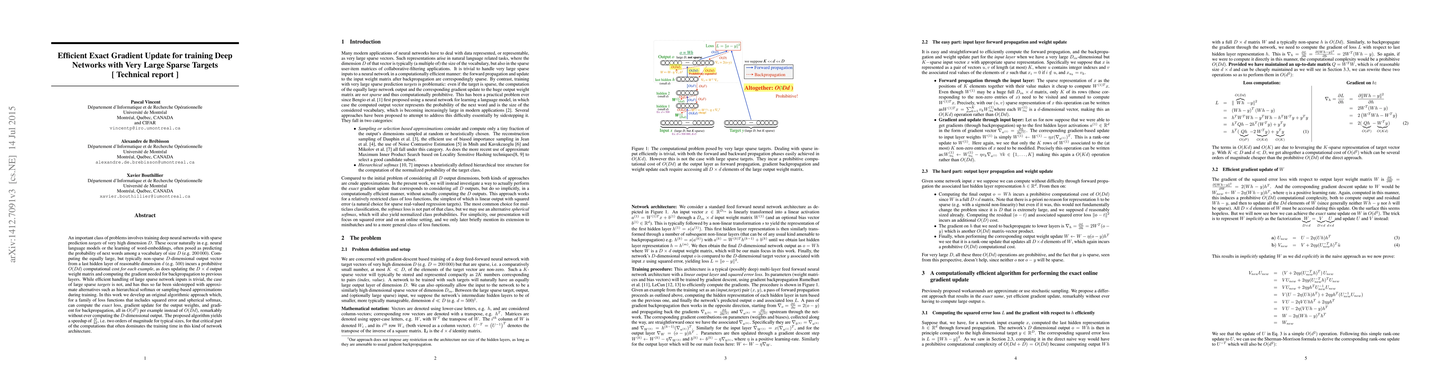 An important class of problems involves training deep neural networks with sparse prediction targets of very high dimension D. These occur naturally in e.g. neural language models or the learning of word-embeddings, often posed as predicting the probability of next words among a vocabulary of size D (e.g. 200 000). Computing the equally large, but typically non-sparse D-dimensional output vector from a last hidden layer of reasonable dimension d (e.g. 500) incurs a prohibitive O(Dd) computational cost for each example, as does updating the D x d output weight matrix and computing the gradient needed for backpropagation to previous layers. While efficient handling of large sparse network inputs is trivial, the case of large sparse targets is not, and has thus so far been sidestepped with approximate alternatives such as hierarchical softmax or sampling-based approximations during training. In this work we develop an original algorithmic approach which, for a family of loss functions that includes squared error and spherical softmax, can compute the exact loss, gradient update for the output weights, and gradient for backpropagation, all in O(d^2) per example instead of O(Dd), remarkably without ever computing the D-dimensional output. The proposed algorithm yields a speedup of D/4d , i.e. two orders of magnitude for typical sizes, for that critical part of the computations that often dominates the training time in this kind of network architecture.