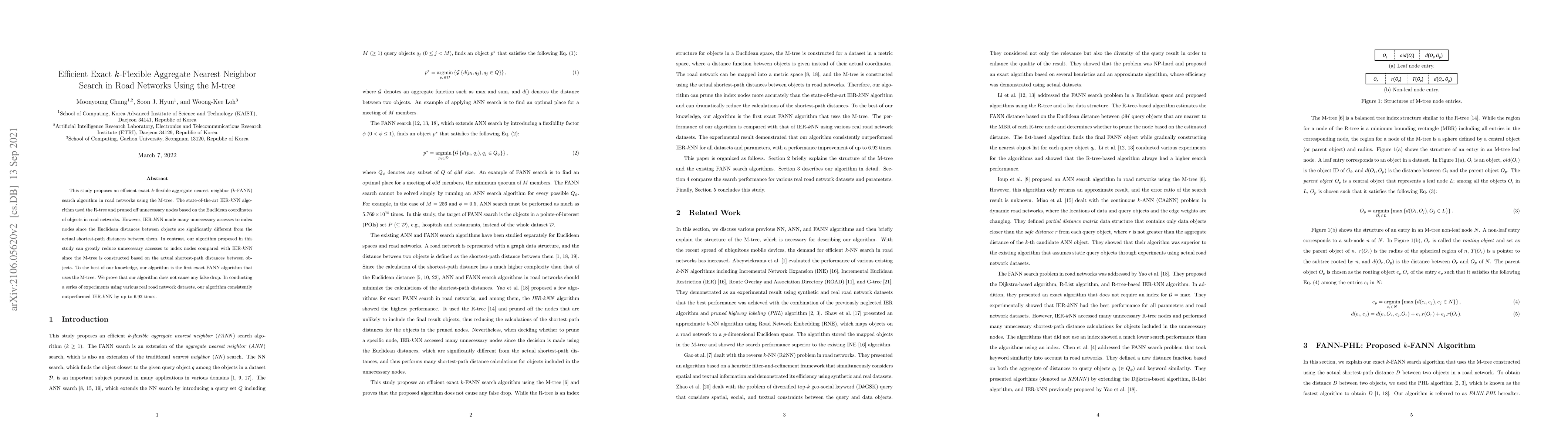 This study proposes an efficient exact k-flexible aggregate nearest neighbor (k-FANN) search algorithm in road networks using the M-tree. The state-of-the-art IER-kNN algorithm used the R-tree and pruned off unnecessary nodes based on the Euclidean coordinates of objects in road networks. However, IER-kNN made many unnecessary accesses to index nodes since the Euclidean distances between objects are significantly different from the actual shortest-path distances between them. In contrast, our algorithm proposed in this study can greatly reduce unnecessary accesses to index nodes compared with IER-kNN since the M-tree is constructed based on the actual shortest-path distances between objects. To the best of our knowledge, our algorithm is the first exact FANN algorithm that uses the M-tree. We prove that our algorithm does not cause any false drop. In conducting a series of experiments using various real road network datasets, our algorithm consistently outperformed IER-kNN by up to 6.92 times.