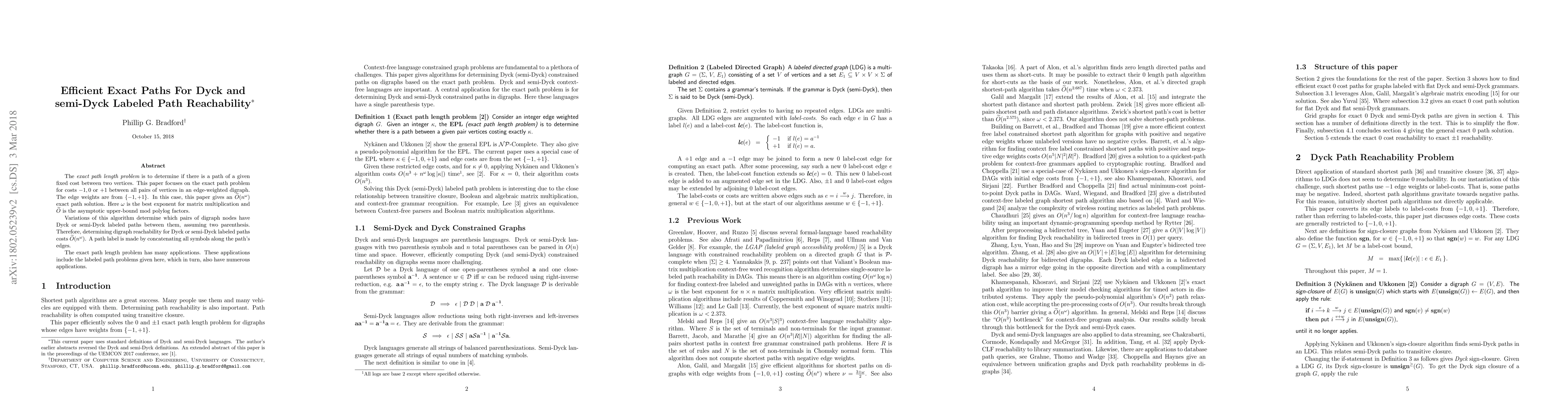 The exact path length problem is to determine if there is a path of a given fixed cost between two vertices. This paper focuses on the exact path problem for costs $-1,0$ or $+1$ between all pairs of vertices in an edge-weighted digraph. The edge weights are from $\{ -1, +1 \}$. In this case, this paper gives an $\widetilde{O}(n^{\omega})$ exact path solution. Here $\omega$ is the best exponent for matrix multiplication and $\widetilde{O}$ is the asymptotic upper-bound mod polylog factors. Variations of this algorithm determine which pairs of digraph nodes have Dyck or semi-Dyck labeled paths between them, assuming two parenthesis. Therefore, determining digraph reachability for Dyck or semi-Dyck labeled paths costs $\widetilde{O}(n^{\omega})$. A path label is made by concatenating all symbols along the path's edges. The exact path length problem has many applications. These applications include the labeled path problems given here, which in turn, also have numerous applications.