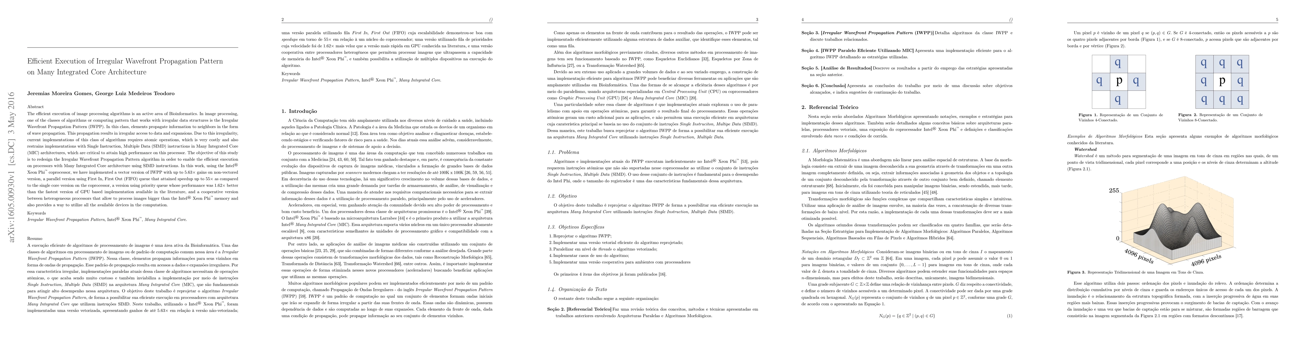 The efficient execution of image processing algorithms is an active area of Bioinformatics. In image processing, one of the classes of algorithms or computing pattern that works with irregular data structures is the Irregular Wavefront Propagation Pattern (IWPP). In this class, elements propagate information to neighbors in the form of wave propagation. This propagation results in irregular access to data and expansions. Due to this irregularity, current implementations of this class of algorithms requires atomic operations, which is very costly and also restrains implementations with Single Instruction, Multiple Data (SIMD) instructions in Many Integrated Core (MIC) architectures, which are critical to attain high performance on this processor. The objective of this study is to redesign the Irregular Wavefront Propagation Pattern algorithm in order to enable the efficient execution on processors with Many Integrated Core architecture using SIMD instructions. In this work, using the Intel (R) Xeon Phi (TM) coprocessor, we have implemented a vector version of IWPP with up to 5.63x gains on non-vectored version, a parallel version using First In, First Out (FIFO) queue that attained speedup up to 55x as compared to the single core version on the coprocessor, a version using priority queue whose performance was 1.62x better than the fastest version of GPU based implementation available in the literature, and a cooperative version between heterogeneous processors that allow to process images bigger than the Intel (R) Xeon Phi (TM) memory and also provides a way to utilize all the available devices in the computation.
