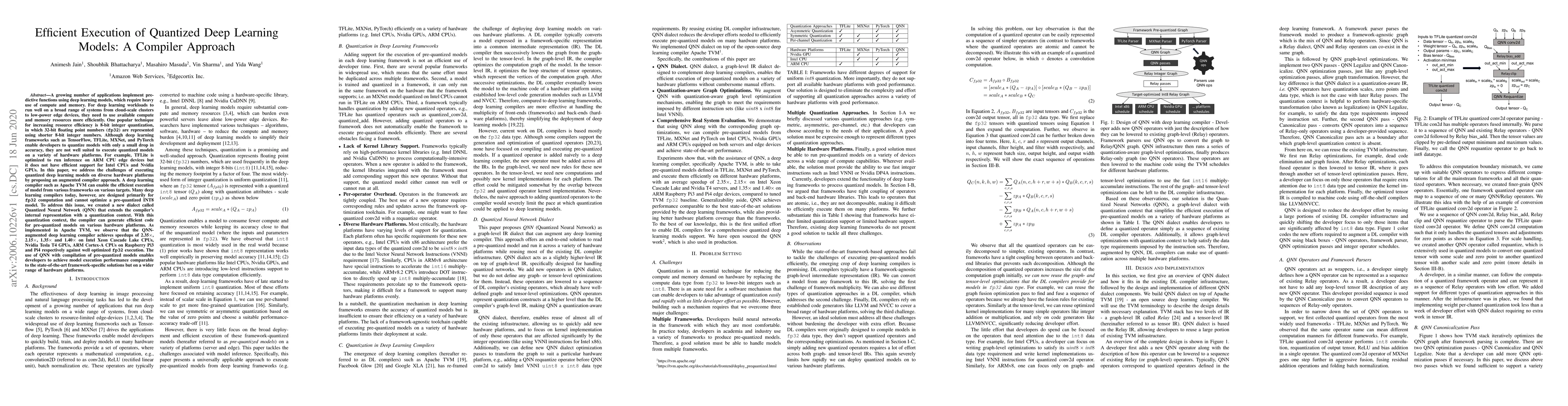 This paper proposes an augmented compiler approach to efficiently execute quantized deep learning models across diverse hardware platforms. The authors introduce a new Quantized Neural Network (QNN) dialect in Apache TVM to optimize pre-quantized INT8 models, achieving notable speedups on various hardware compared to traditional fp32 execution.