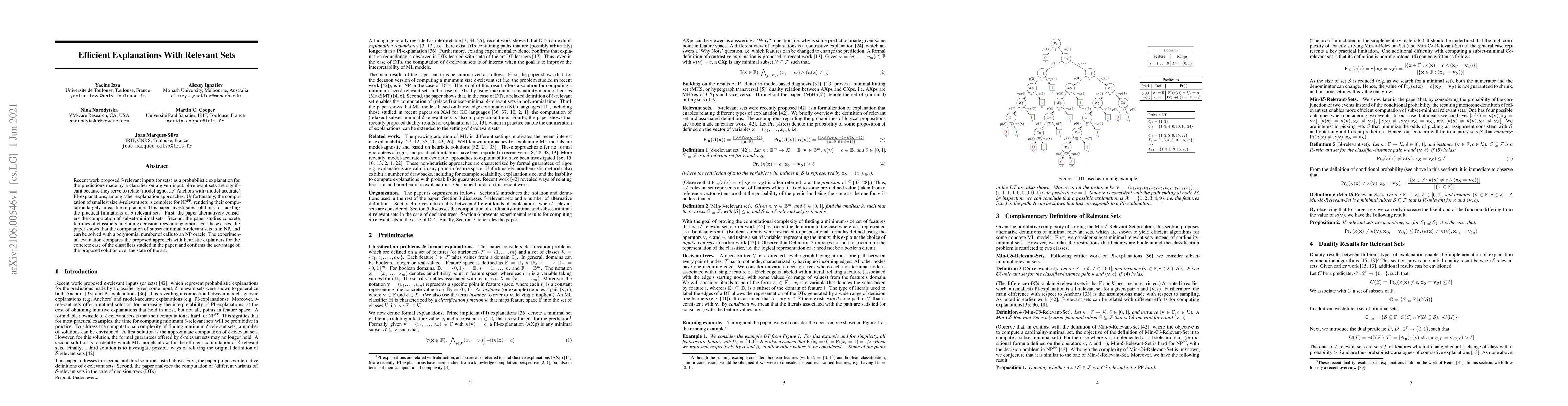 Recent work proposed $\delta$-relevant inputs (or sets) as a probabilistic explanation for the predictions made by a classifier on a given input. $\delta$-relevant sets are significant because they serve to relate (model-agnostic) Anchors with (model-accurate) PI- explanations, among other explanation approaches. Unfortunately, the computation of smallest size $\delta$-relevant sets is complete for ${NP}^{PP}$, rendering their computation largely infeasible in practice. This paper investigates solutions for tackling the practical limitations of $\delta$-relevant sets. First, the paper alternatively considers the computation of subset-minimal sets. Second, the paper studies concrete families of classifiers, including decision trees among others. For these cases, the paper shows that the computation of subset-minimal $\delta$-relevant sets is in NP, and can be solved with a polynomial number of calls to an NP oracle. The experimental evaluation compares the proposed approach with heuristic explainers for the concrete case of the classifiers studied in the paper, and confirms the advantage of the proposed solution over the state of the art.