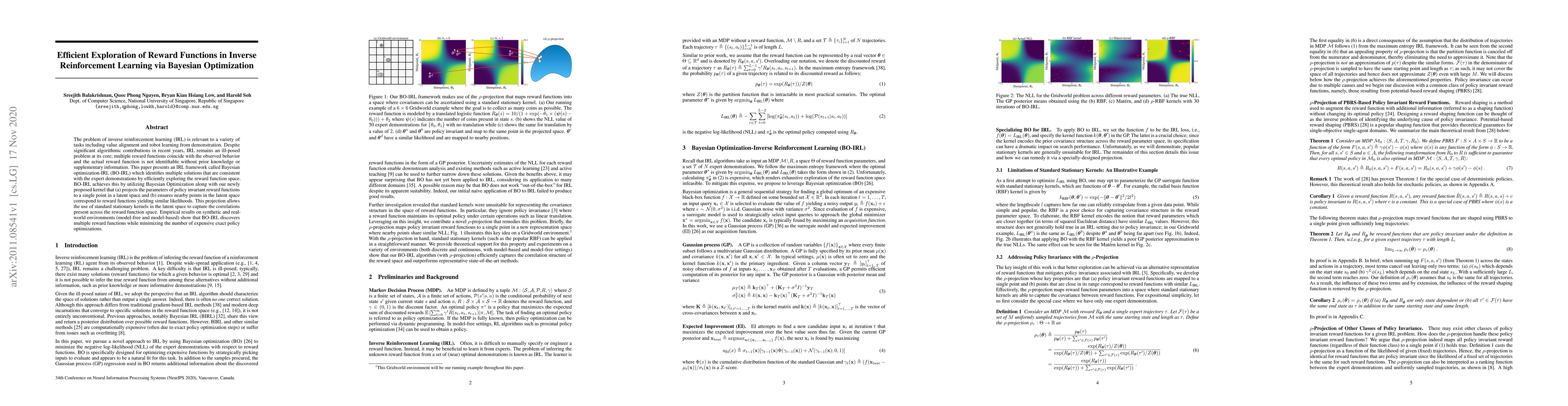 This paper introduces Bayesian optimization-IRL (BO-IRL) for inverse reinforcement learning, employing a novel kernel to project policy invariant reward functions into a latent space and efficiently explore the reward function space. Empirical results show it identifies multiple consistent reward functions with fewer policy optimizations.