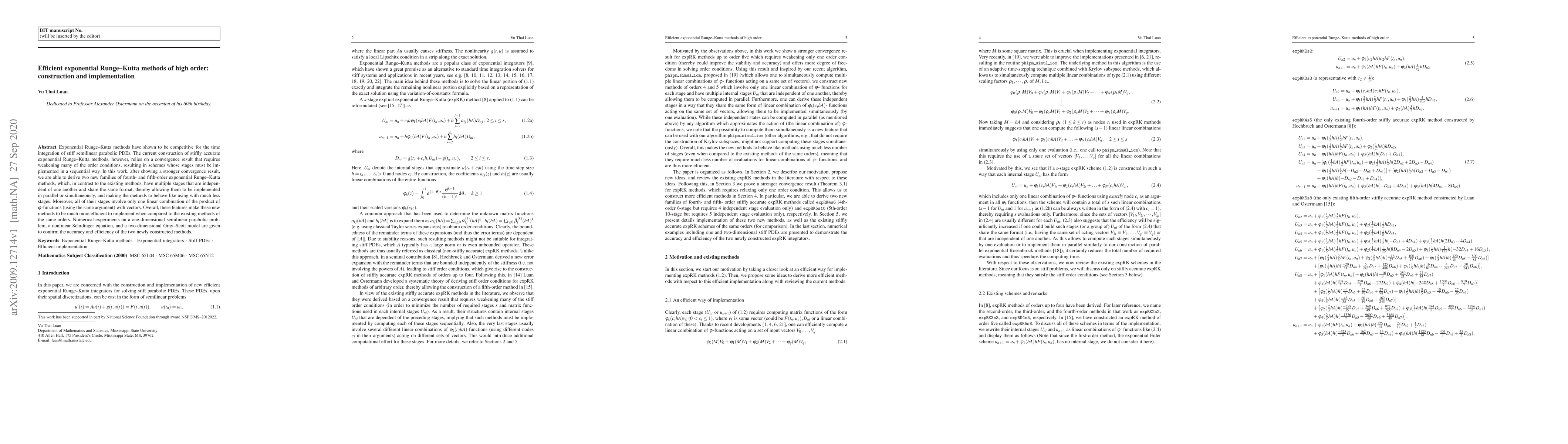 This paper introduces two new high-order exponential Runge-Kutta methods for solving stiff semilinear parabolic PDEs, which are more efficient due to their independent, parallelizable stages and simplified implementation. Numerical experiments validate their accuracy and efficiency.