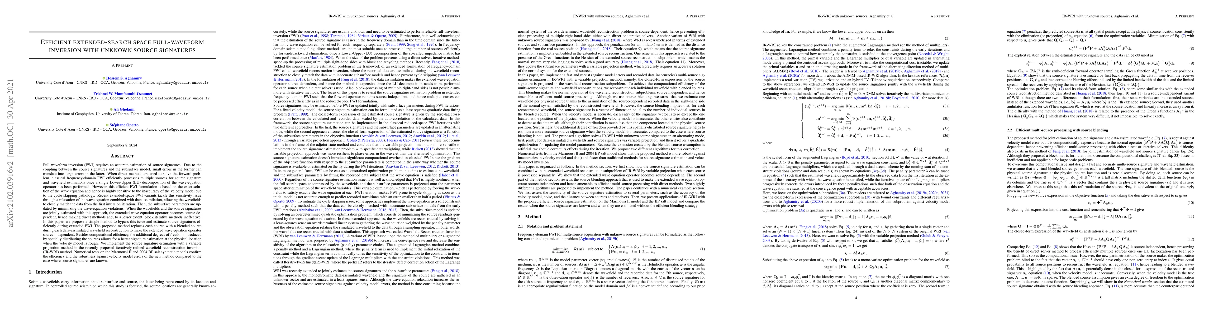 This paper proposes an efficient method for estimating source signatures in extended-search space full waveform inversion (FWI) by replacing each source with a blended source during wavefield reconstruction, making the extended wave equation operator source independent. The method enhances computational efficiency and improves signature estimation accuracy, especially in rough velocity models, as demonstrated by numerical tests on synthetic models.