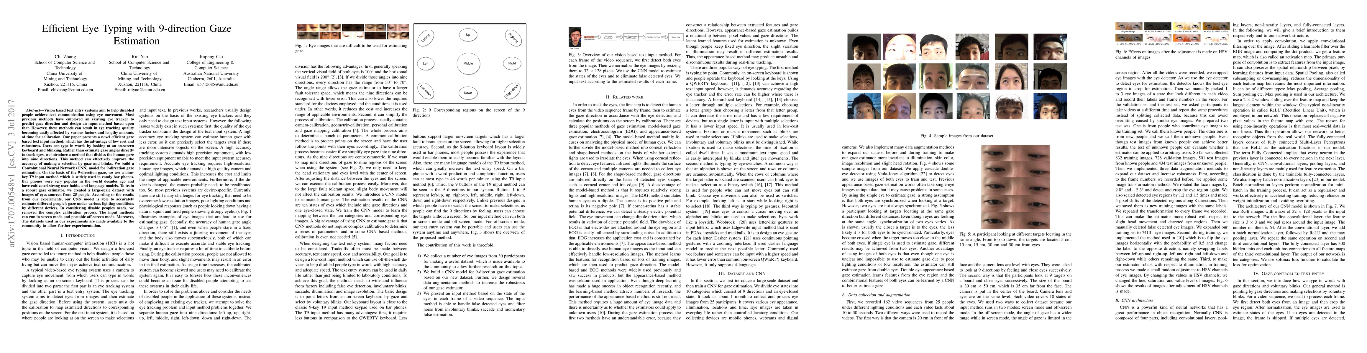 Vision based text entry systems aim to help disabled people achieve text communication using eye movement. Most previous methods have employed an existing eye tracker to predict gaze direction and design an input method based upon that. However, these methods can result in eye tracking quality becoming easily affected by various factors and lengthy amounts of time for calibration. Our paper presents a novel efficient gaze based text input method, which has the advantage of low cost and robustness. Users can type in words by looking at an on-screen keyboard and blinking. Rather than estimate gaze angles directly to track eyes, we introduce a method that divides the human gaze into nine directions. This method can effectively improve the accuracy of making a selection by gaze and blinks. We build a Convolutional Neural Network (CNN) model for 9-direction gaze estimation. On the basis of the 9-direction gaze, we use a nine-key T9 input method which is widely used in candy bar phones. Bar phones were very popular in the world decades ago and have cultivated strong user habits and language models. To train a robust gaze estimator, we created a large-scale dataset with images of eyes sourced from 25 people. According to the results from our experiments, our CNN model is able to accurately estimate different people's gaze under various lighting conditions by different devices. In considering disable people's needs, we removed the complex calibration process. The input methods can run in screen mode and portable off-screen mode. Moreover, The datasets used in our experiments are made available to the community to allow further experimentation.
