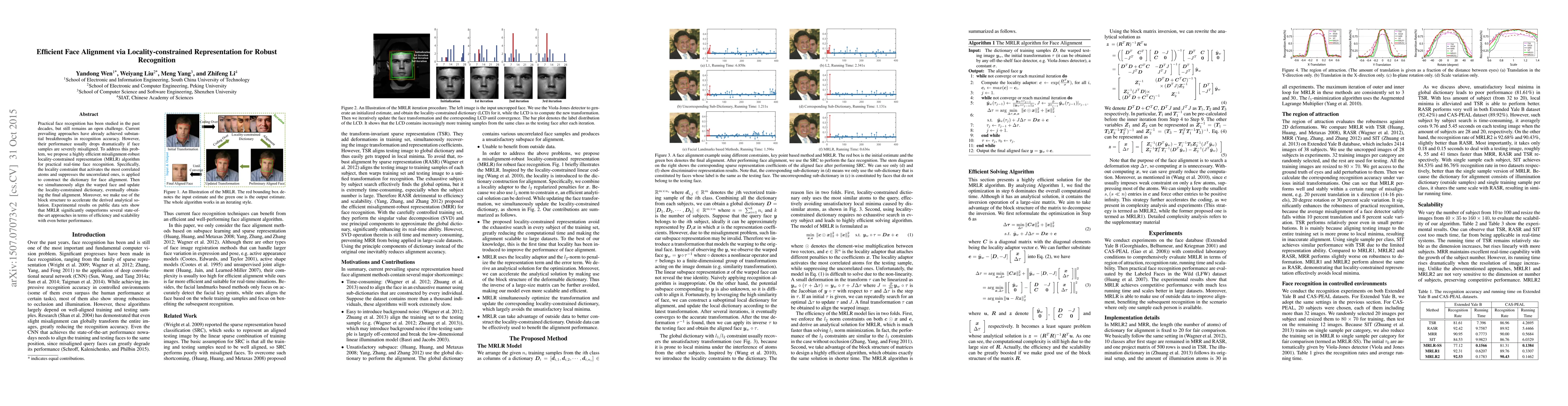 This paper proposes an efficient misalignment-robust locality-constrained representation (MRLR) algorithm for real-time face recognition, which significantly improves performance under severe face misalignments by iteratively aligning faces and updating the dictionary, achieving better results than state-of-the-art methods.