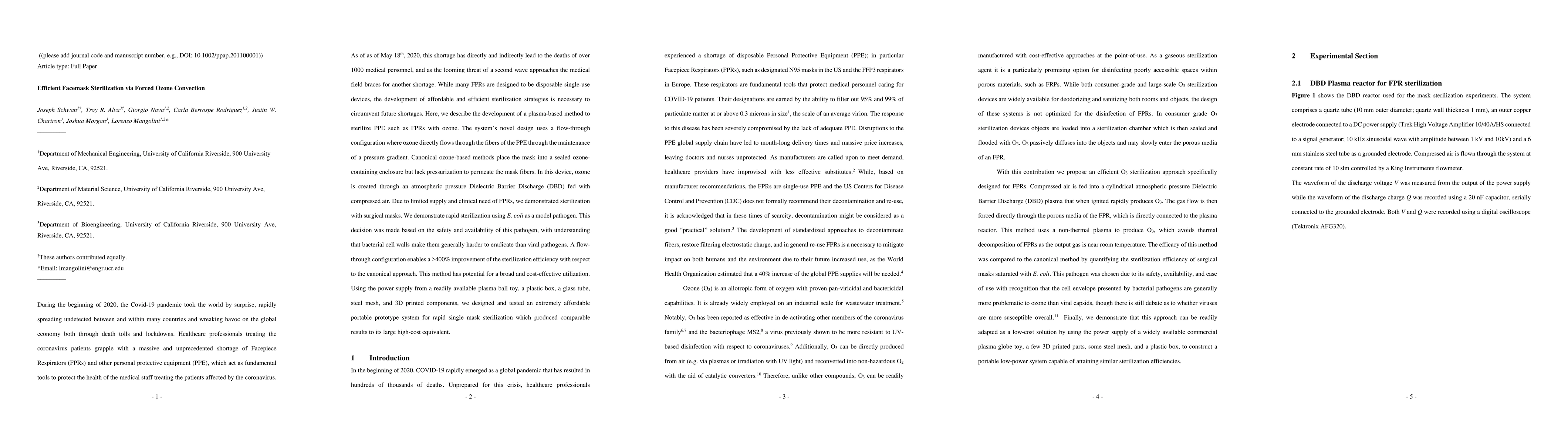 This paper presents a novel, efficient method for sterilizing facemasks using forced ozone convection through a flow-through design, significantly improving sterilization efficiency by over 400% compared to traditional methods. The proposed plasma-based system, utilizing a low-cost portable prototype, demonstrates rapid and effective sterilization of surgical masks using E. coli as a model pathogen.
