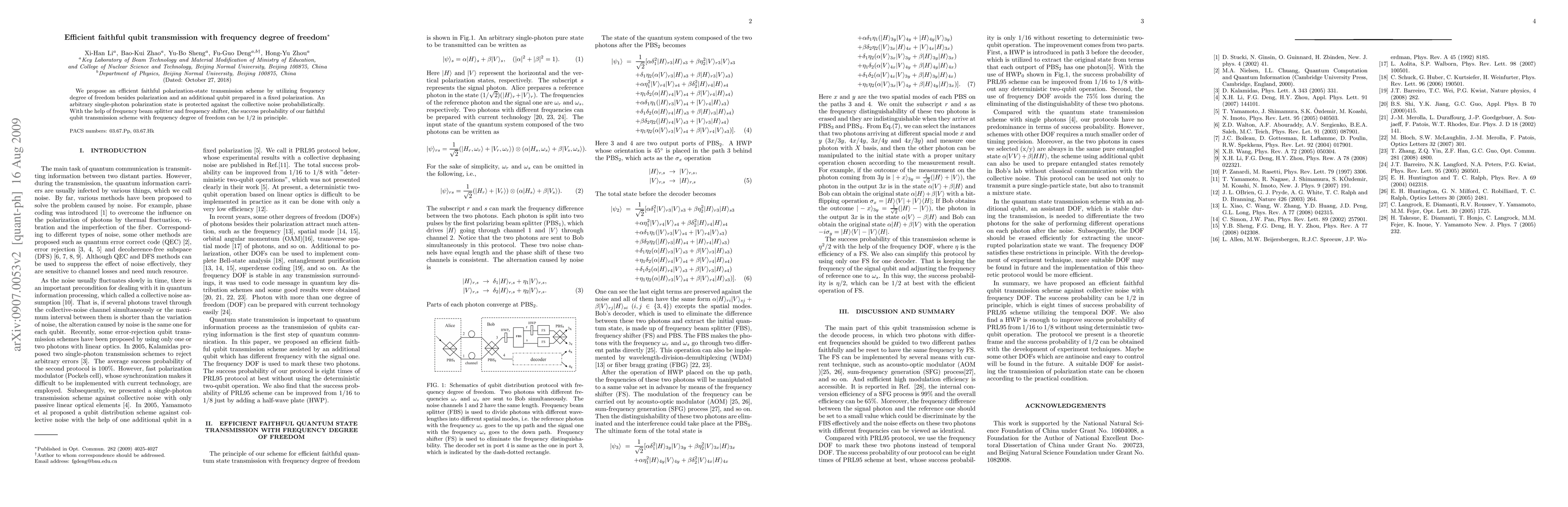 This paper proposes an efficient method for faithful qubit transmission using both polarization and frequency degrees of freedom, ensuring protection against collective noise. The scheme achieves a success probability of 1/2 through the use of frequency beam splitters and frequency shifters.