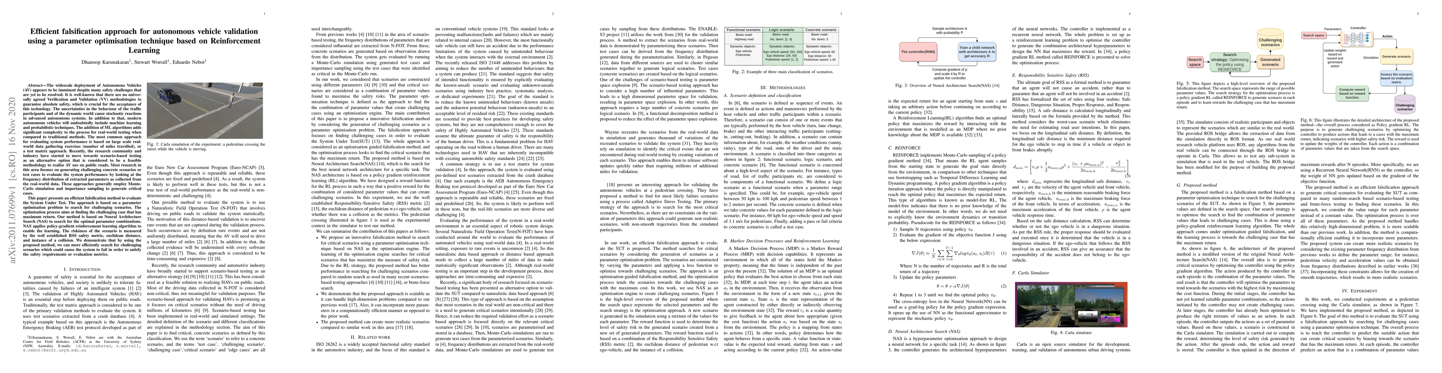 This paper proposes an efficient falsification method for autonomous vehicle validation using a reinforcement learning-based parameter optimisation technique to identify challenging scenarios that could potentially cause system failures. The method aims to enhance safety validation by efficiently finding critical test cases using policy-gradient reinforcement learning.