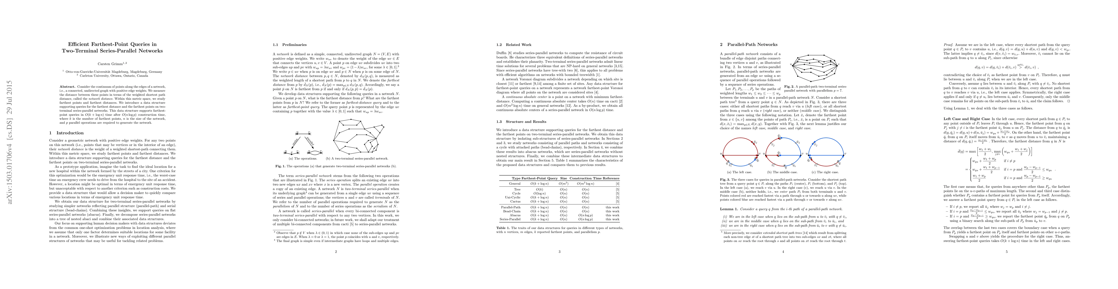This paper presents a data structure for efficiently querying farthest points and distances in two-terminal series-parallel networks, achieving $O(k + \log n)$ query time after $O(n \log p)$ construction, where $k$ is the number of farthest points and $p$ denotes parallel operations.