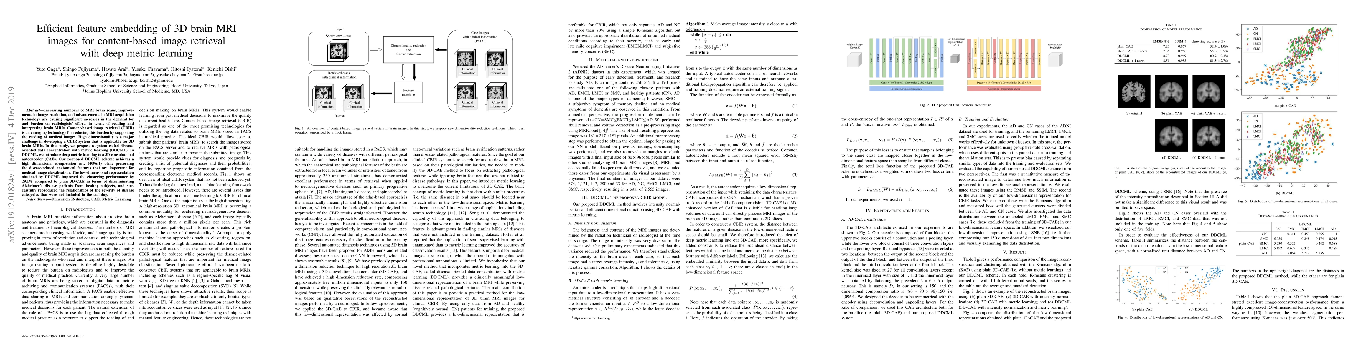 This paper proposes a system called DDCML that combines deep metric learning with a 3D convolutional autoencoder to efficiently embed 3D brain MRI images for content-based image retrieval. The DDCML scheme achieves a high dimensional compression rate while preserving disease-related features, improving clustering performance by 29.1% for Alzheimer's disease classification.