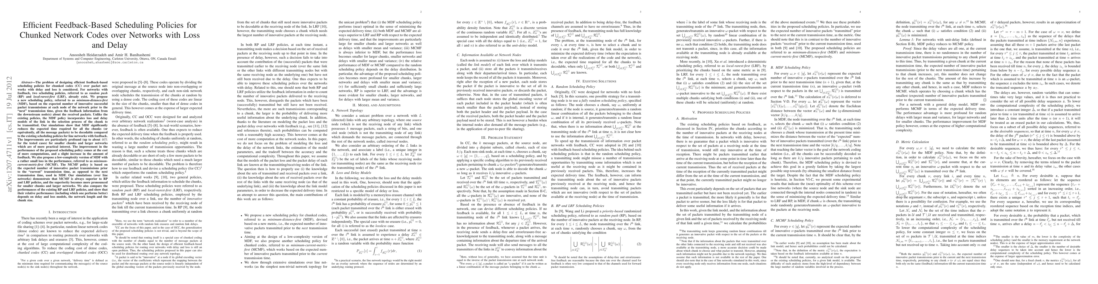 The problem of designing efficient feedback-based scheduling policies for chunked codes (CC) over packet networks with delay and loss is considered. For networks with feedback, two scheduling policies, referred to as random push (RP) and local-rarest-first (LRF), already exist. We propose a new scheduling policy, referred to as minimum-distance-first (MDF), based on the expected number of innovative successful packet transmissions at each node of the network prior to the "next" transmission time, given the feedback information from the downstream node(s) about the received packets. Unlike the existing policies, the MDF policy incorporates loss and delay models of the link in the selection process of the chunk to be transmitted. Our simulations show that MDF significantly reduces the expected time required for all the chunks (or equivalently, all the message packets) to be decodable compared to the existing scheduling policies for line networks with feedback. The improvements are particularly profound (up to about 46% for the tested cases) for smaller chunks and larger networks which are of more practical interest. The improvement in the performance of the proposed scheduling policy comes at the cost of more computations, and a slight increase in the amount of feedback. We also propose a low-complexity version of MDF with a rather small loss in the performance, referred to as minimumcurrent-metric-first (MCMF). The MCMF policy is based on the expected number of innovative packet transmissions prior to the "current" transmission time, as opposed to the next transmission time, used in MDF. Our simulations (over line networks) demonstrate that MCMF is always superior to RP and LRF policies, and the superiority becomes more pronounced for smaller chunks and larger networks.