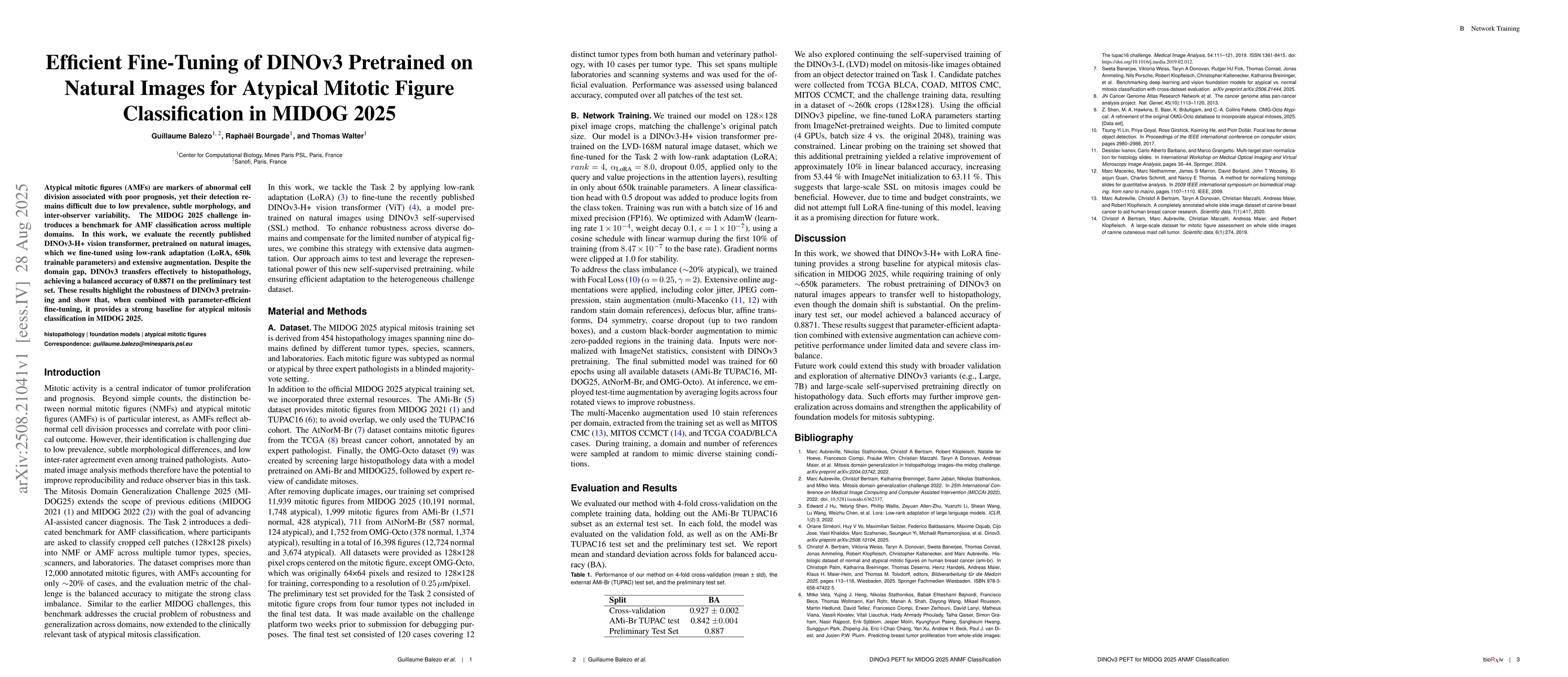 Atypical mitotic figures (AMFs) are markers of abnormal cell division associated with poor prognosis, yet their detection remains difficult due to low prevalence, subtle morphology, and inter-observer variability. The MIDOG 2025 challenge introduces a benchmark for AMF classification across multiple domains. In this work, we evaluate the recently published DINOv3-H+ vision transformer, pretrained on natural images, which we fine-tuned using low-rank adaptation (LoRA, 650k trainable parameters) and extensive augmentation. Despite the domain gap, DINOv3 transfers effectively to histopathology, achieving a balanced accuracy of 0.8871 on the preliminary test set. These results highlight the robustness of DINOv3 pretraining and show that, when combined with parameter-efficient fine-tuning, it provides a strong baseline for atypical mitosis classification in MIDOG 2025.