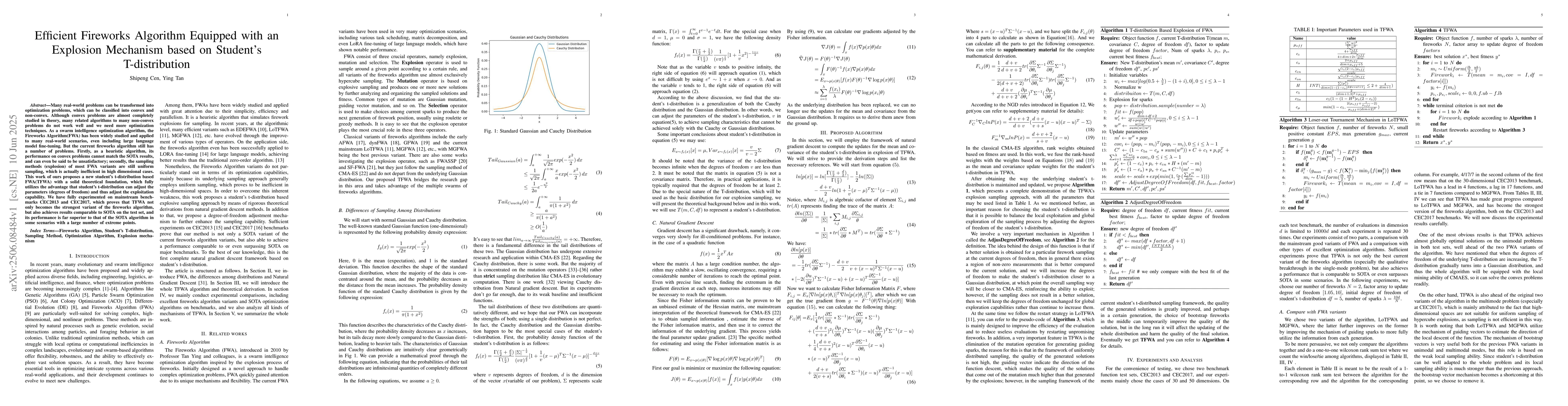 Many real-world problems can be transformed into optimization problems, which can be classified into convex and non-convex. Although convex problems are almost completely studied in theory, many related algorithms to many non-convex problems do not work well and we need more optimization techniques. As a swarm intelligence optimization algorithm, the Fireworks Algorithm(FWA) has been widely studied and applied to many real-world scenarios, even including large language model fine-tuning. But the current fireworks algorithm still has a number of problems. Firstly, as a heuristic algorithm, its performance on convex problems cannot match the SOTA results, and can even be said to be unsatisfactory; secondly, the sampling methods (explosion) of most FWA variants are still uniform sampling, which is actually inefficient in high dimensional cases. This work of ours proposes a new student's t-distribution based FWA(TFWA) with a solid theoretical foundation, which fully utilizes the advantage that student's t-distribution can adjust the parameters (degrees of freedom) and thus adjust the exploitation capability. We have fully experimented on mainstream benchmarks CEC2013 and CEC2017, which proves that TFWA not only becomes the strongest variant of the fireworks algorithm, but also achieves results comparable to SOTA on the test set, and its performance is far superior to that of the SOTA algorithm in some scenarios with a large number of extreme points.