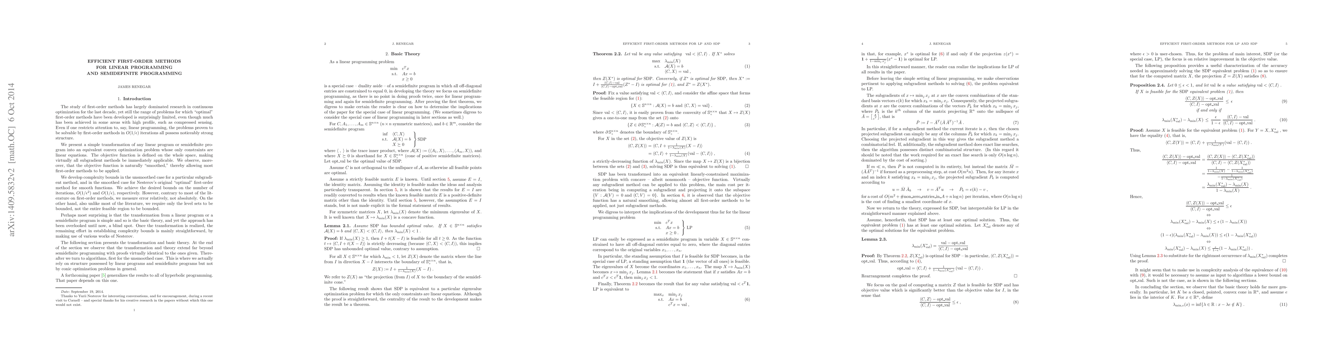 A new transformation method transforms linear programs and semidefinite problems into convex optimization problems with only linear constraints, making them suitable for first-order methods, which achieve complexity bounds of O(1/epsilon^2) and O(1/epsilon).