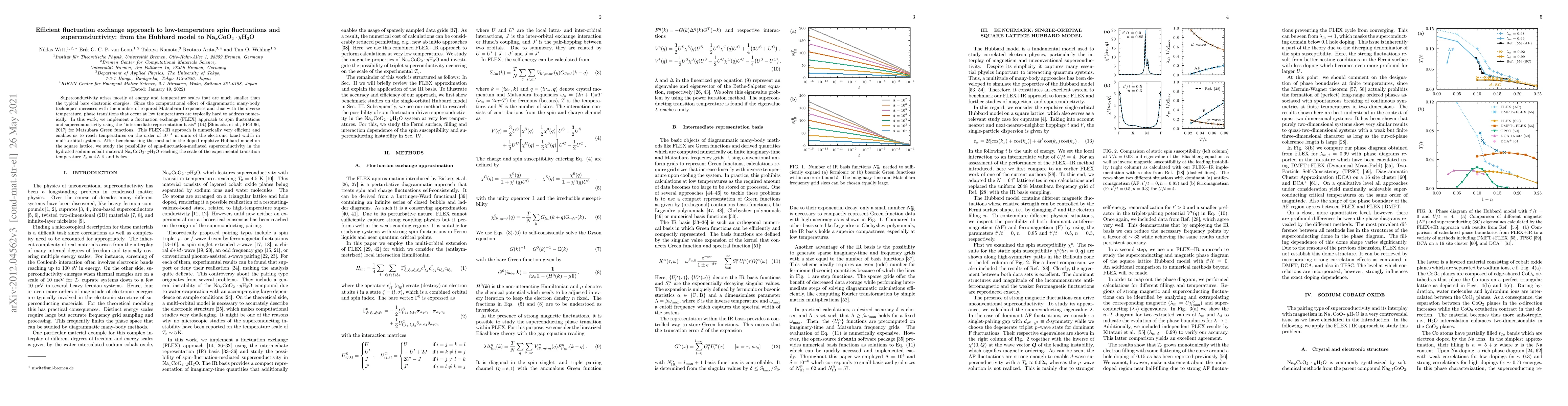 This paper introduces a numerically efficient fluctuation exchange (FLEX) approach combined with the intermediate representation basis (IR) to study low-temperature spin fluctuations and superconductivity, successfully applying it to the Hubbard model and exploring spin-fluctuation-mediated superconductivity in Na$_x$CoO$_2\cdot y$H$_2$O. The method achieves temperatures close to the experimental transition temperature of $T_{\mathrm{c}}=4.5$ K.