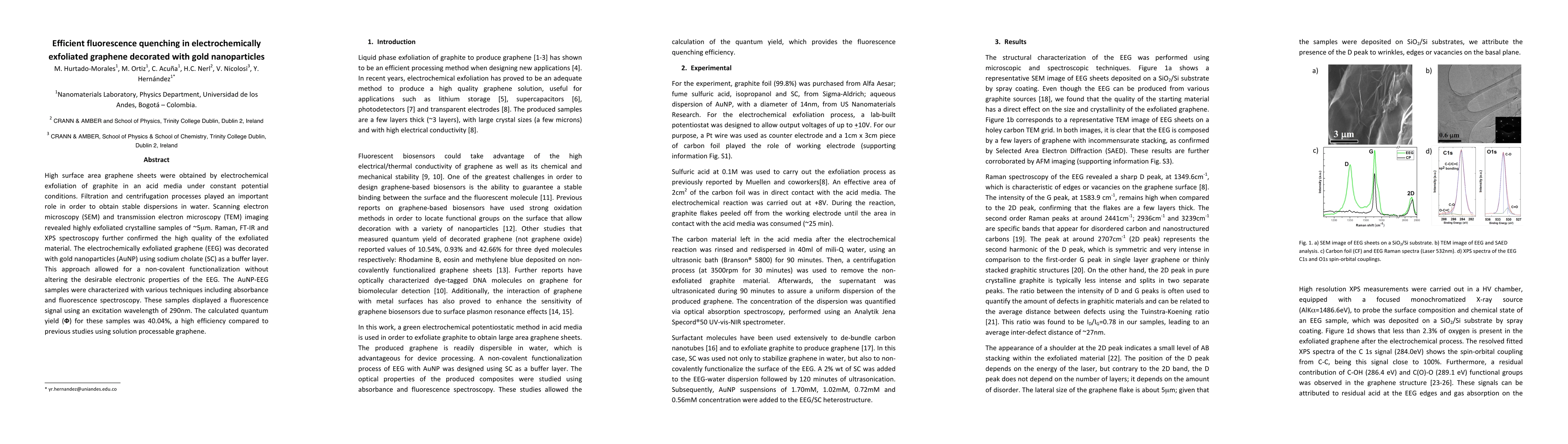 This study presents electrochemically exfoliated graphene sheets (EEG) decorated with gold nanoparticles (AuNP) for efficient fluorescence quenching. The EEG-AuNP composites maintain high-quality electronic properties and exhibit a quantum yield of 40.04%, demonstrating significant fluorescence quenching efficiency.