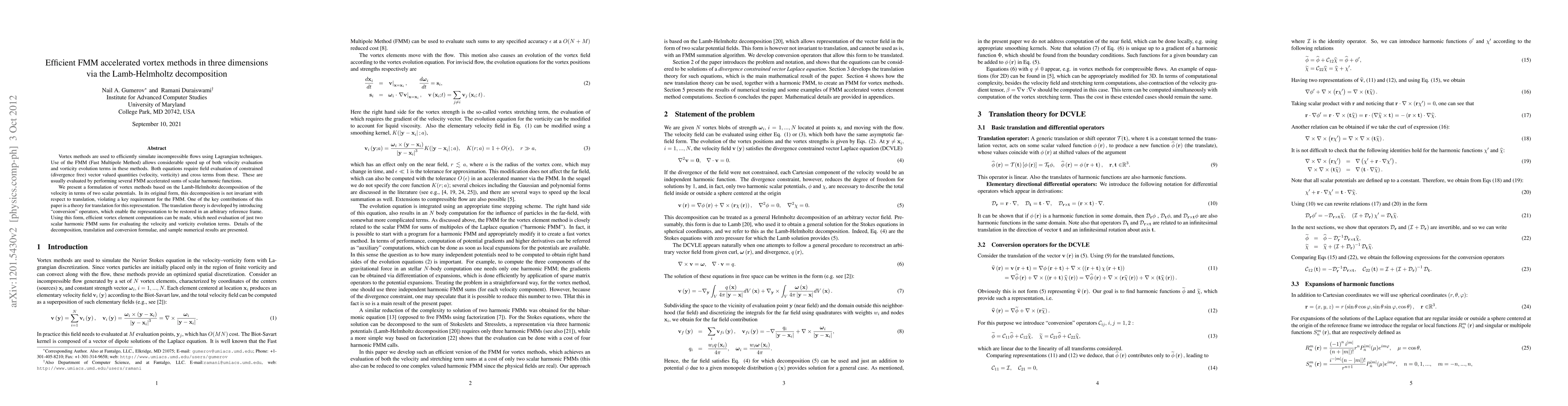 This paper proposes an efficient three-dimensional vortex method for incompressible flow simulations using the Fast Multipole Method (FMM) and the Lamb-Helmholtz decomposition. It introduces a translation theory for the decomposition, enabling efficient evaluation of velocity and vorticity evolution terms via just two scalar harmonic FMM sums.