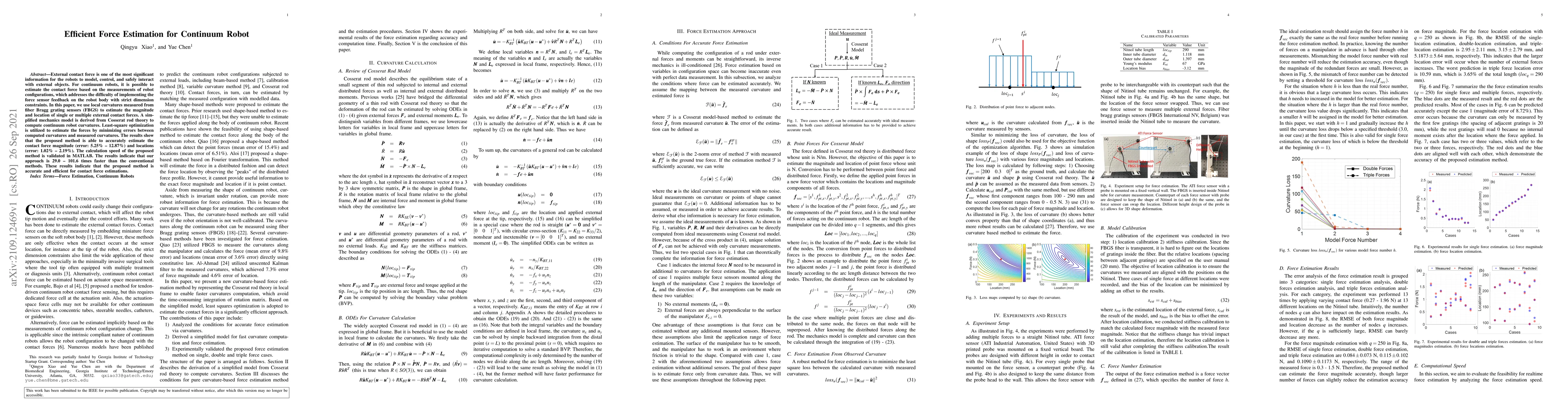 External contact force is one of the most significant information for the robots to model, control, and safely interact with external objects. For continuum robots, it is possible to estimate the contact force based on the measurements of robot configurations, which addresses the difficulty of implementing the force sensor feedback on the robot body with strict dimension constraints. In this paper, we use local curvatures measured from fiber Bragg grating sensors (FBGS) to estimate the magnitude and location of single or multiple external contact forces. A simplified mechanics model is derived from Cosserat rod theory to compute continuum robot curvatures. Least-square optimization is utilized to estimate the forces by minimizing errors between computed curvatures and measured curvatures. The results show that the proposed method is able to accurately estimate the contact force magnitude (error: 5.25\% -- 12.87\%) and locations (error: 1.02\% -- 2.19\%). The calculation speed of the proposed method is validated in MATLAB. The results indicate that our approach is 29.0 -- 101.6 times faster than the conventional methods. These results indicate that the proposed method is accurate and efficient for contact force estimations.