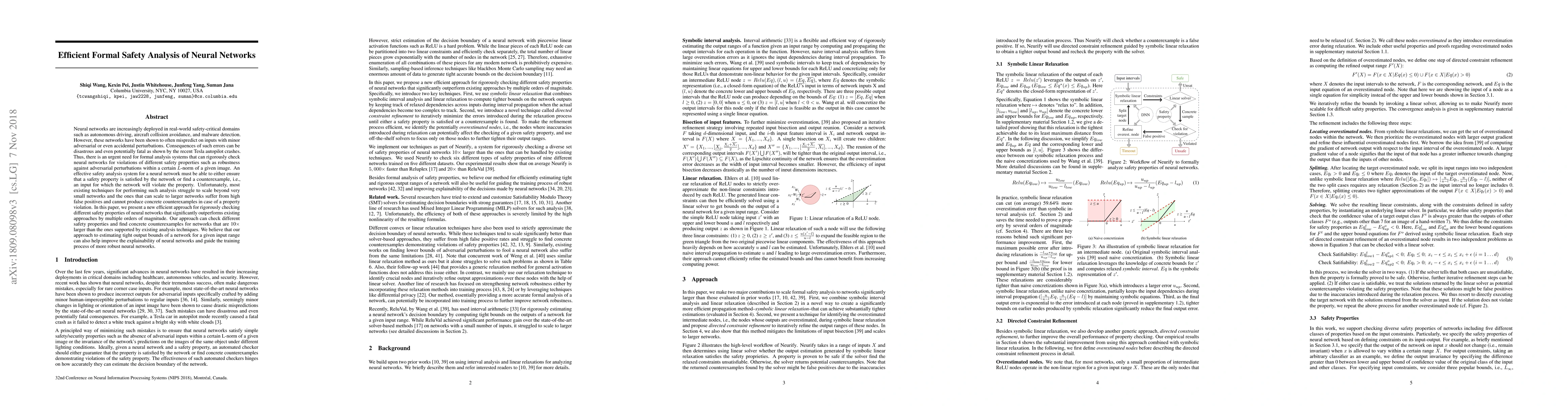 A new approach for formal safety analysis of neural networks significantly outperforms existing methods, allowing for rigorous checks on larger networks with fewer false positives, and providing concrete counterexamples when safety properties are violated.