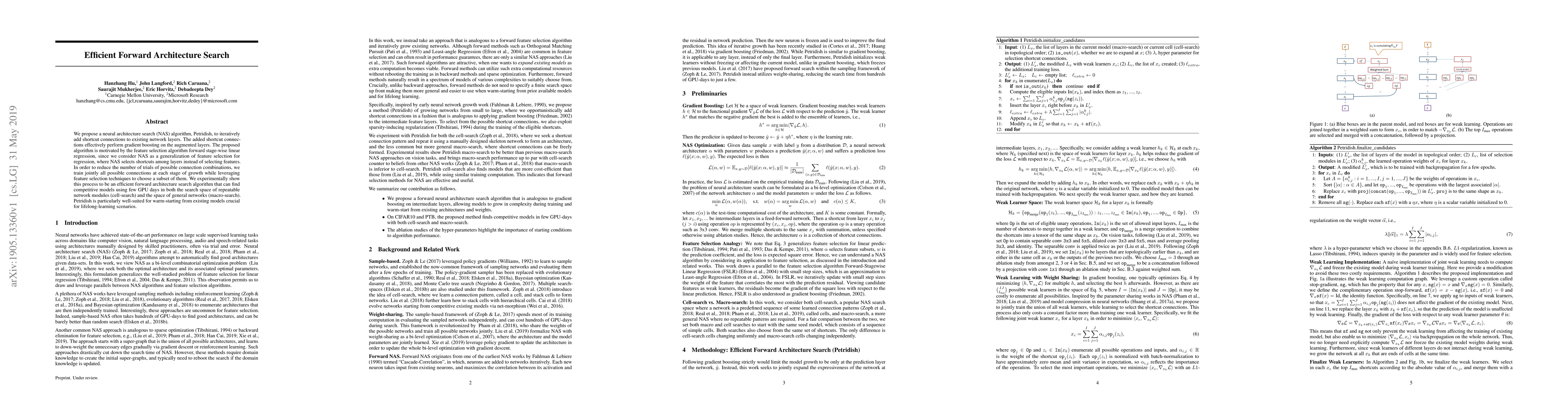 Petridish proposes a neural architecture search algorithm that efficiently adds shortcut connections to layers, reducing GPU days required for competitive models in both cell-search and macro-search spaces.