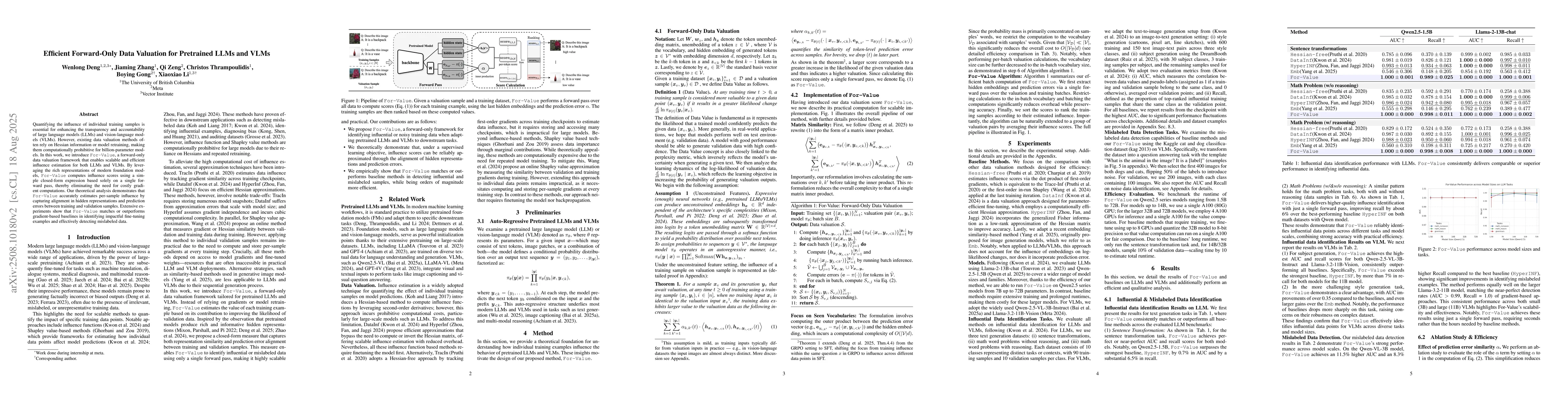 Quantifying the influence of individual training samples is essential for enhancing the transparency and accountability of large language models (LLMs) and vision-language models (VLMs). However, existing data valuation methods often rely on Hessian information or model retraining, making them computationally prohibitive for billion-parameter models. In this work, we introduce For-Value, a forward-only data valuation framework that enables scalable and efficient influence estimation for both LLMs and VLMs. By leveraging the rich representations of modern foundation models, For-Value computes influence scores using a simple closed-form expression based solely on a single forward pass, thereby eliminating the need for costly gradient computations. Our theoretical analysis demonstrates that For-Value accurately estimates per-sample influence by capturing alignment in hidden representations and prediction errors between training and validation samples. Extensive experiments show that For-Value matches or outperforms gradient-based baselines in identifying impactful fine-tuning examples and effectively detecting mislabeled data.