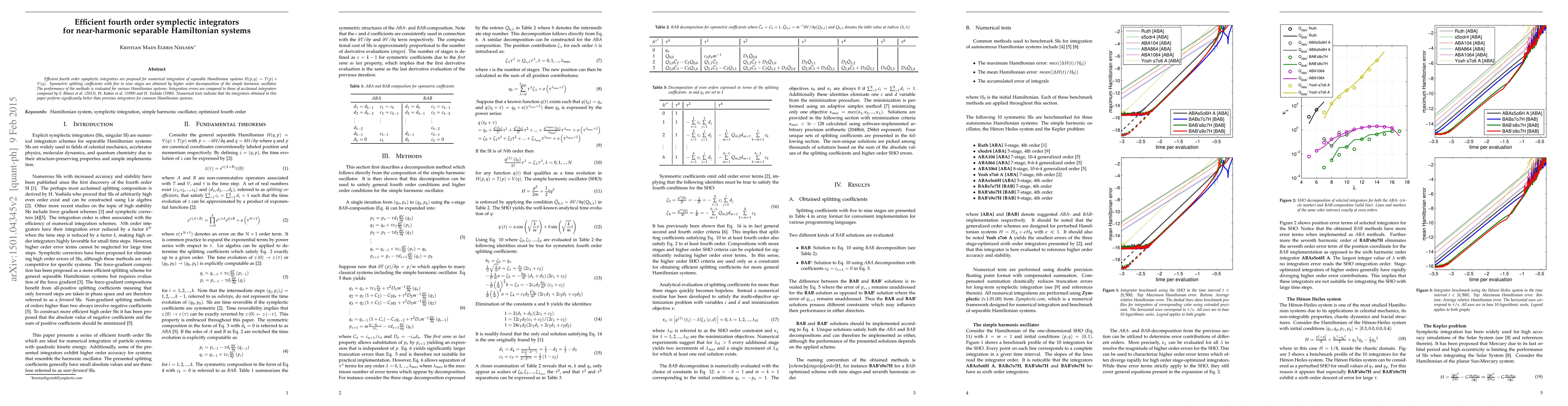 This paper proposes efficient fourth-order symplectic integrators for separable Hamiltonian systems, utilizing symmetric splitting methods with five to nine stages. The new methods outperform existing integrators by reducing integration errors for various Hamiltonian systems.