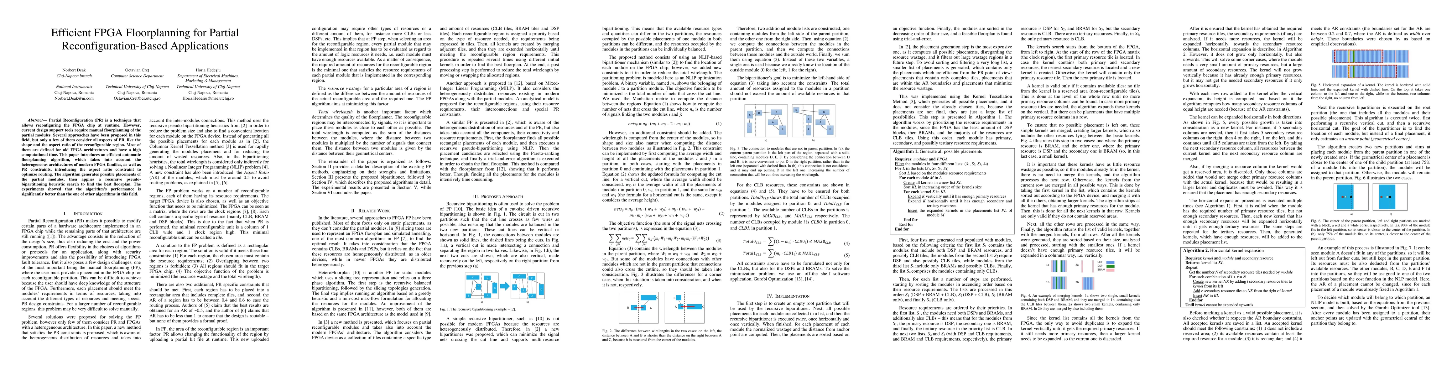 Partial Reconfiguration (PR) is a technique that allows reconfiguring the FPGA chip at runtime. However, current design support tools require manual floorplanning of the partial modules. Several approaches have been proposed in this field, but only a few of them consider all aspects of PR, like the shape and the aspect ratio of the reconfigurable region. Most of them are defined for old FPGA architectures and have a high computational time. This paper introduces an efficient automatic floorplanning algorithm, which takes into account the heterogeneous architectures of modern FPGA families, as well as PR constraints, introducing the aspect ratio constraint to optimize routing. The algorithm generates possible placements of the partial modules, then applies a recursive pseudo-bipartitioning heuristic search to find the best floorplan. The experiments showed that the algorithm's performance is significantly better than the one of other algorithms in this field.