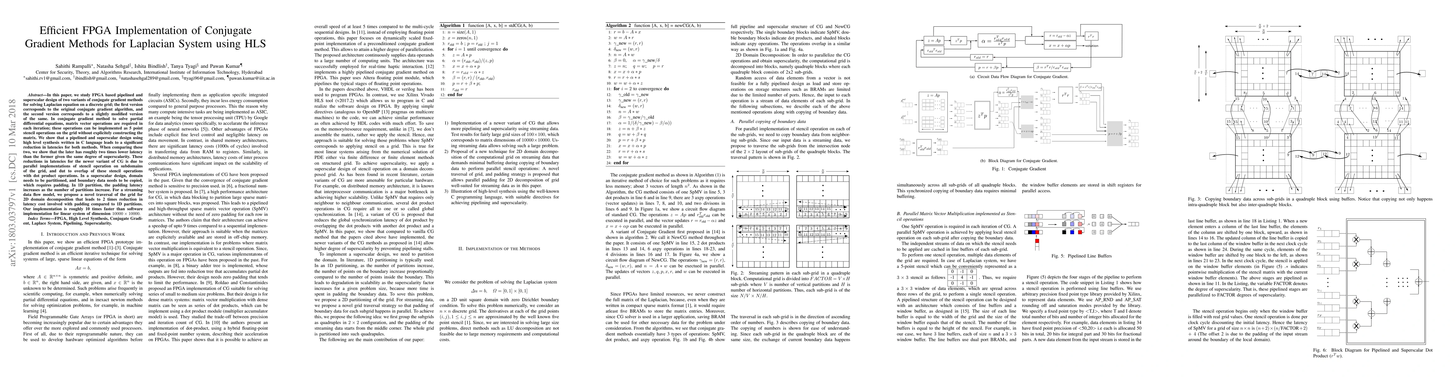 This paper presents FPGA-based implementations of conjugate gradient methods for solving Laplacian systems, using high-level synthesis. It demonstrates that a pipelined and superscalar design significantly reduces latencies compared to the original algorithm, with the modified version achieving roughly half the latency due to parallel stencil operations and efficient data flow management.