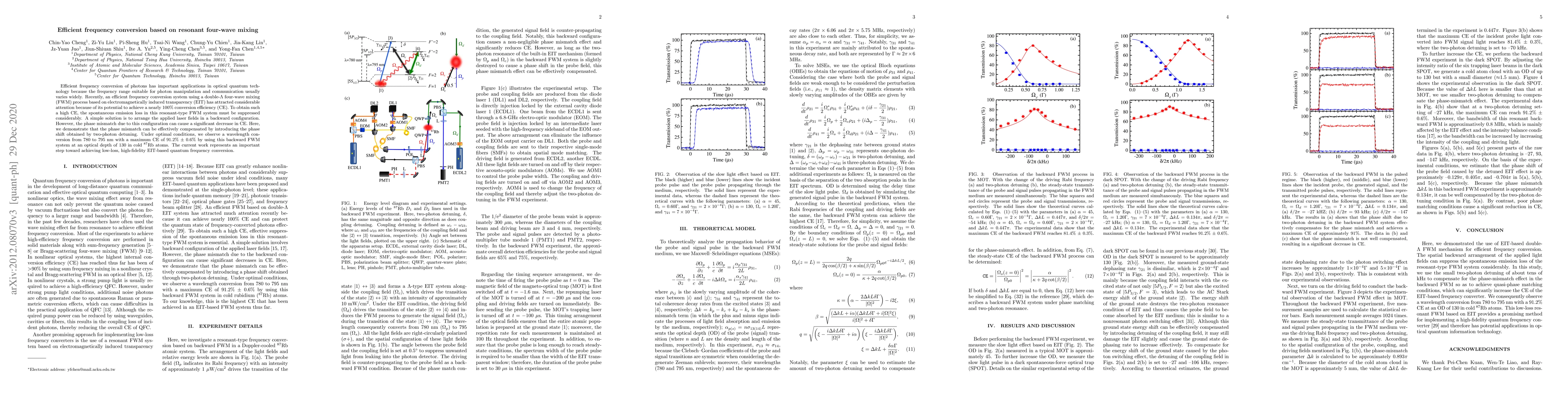 This paper presents an efficient frequency conversion method using a double-$\Lambda$ four-wave mixing process based on electromagnetically induced transparency (EIT) to achieve nearly 100% conversion efficiency. The authors compensate for phase mismatch in a backward configuration by introducing a phase shift from two-photon detuning, achieving a maximum conversion efficiency of 91.2(6)%.