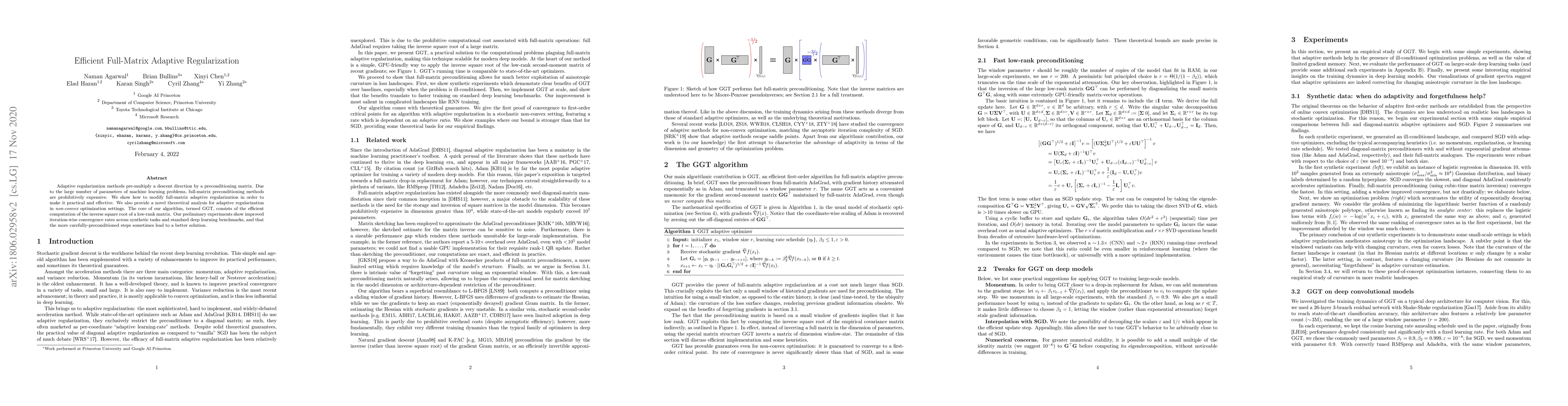 Adaptive regularization methods pre-multiply a descent direction by a preconditioning matrix. Due to the large number of parameters of machine learning problems, full-matrix preconditioning methods are prohibitively expensive. We show how to modify full-matrix adaptive regularization in order to make it practical and effective. We also provide a novel theoretical analysis for adaptive regularization in non-convex optimization settings. The core of our algorithm, termed GGT, consists of the efficient computation of the inverse square root of a low-rank matrix. Our preliminary experiments show improved iteration-wise convergence rates across synthetic tasks and standard deep learning benchmarks, and that the more carefully-preconditioned steps sometimes lead to a better solution.