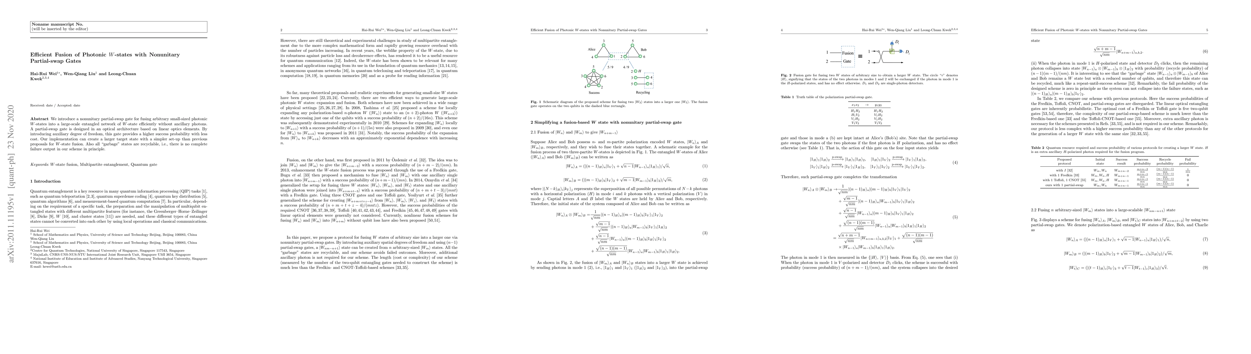 This paper proposes a nonunitary partial-swap gate for efficiently fusing photonic W-states into a larger entangled network without ancillary photons, using linear optical elements. The method achieves higher success probability and recyclability of "garbage" states, offering a simpler setup compared to previous fusion techniques.