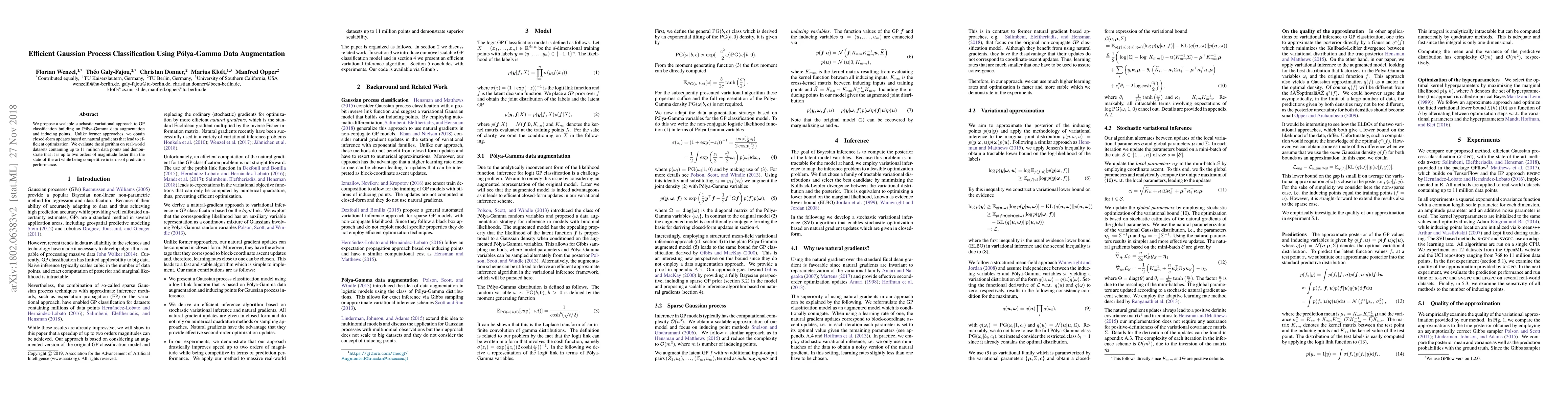 This paper proposes a new method for Gaussian Process classification that is up to two orders of magnitude faster than existing methods while maintaining competitive performance, using Polya-Gamma data augmentation and natural gradients.