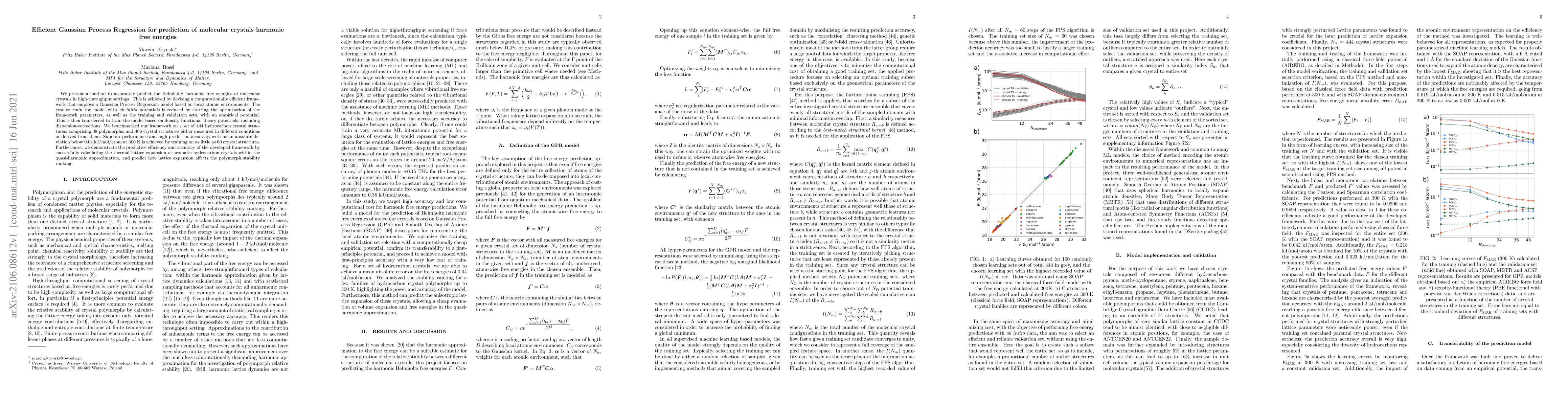 This research paper presents a method to predict molecular crystal harmonic free energies efficiently using Gaussian Process Regression, achieving high accuracy with minimal training data. The framework is demonstrated on 444 hydrocarbon crystal structures, showing superior performance in predicting thermal lattice expansion and polymorph stability.