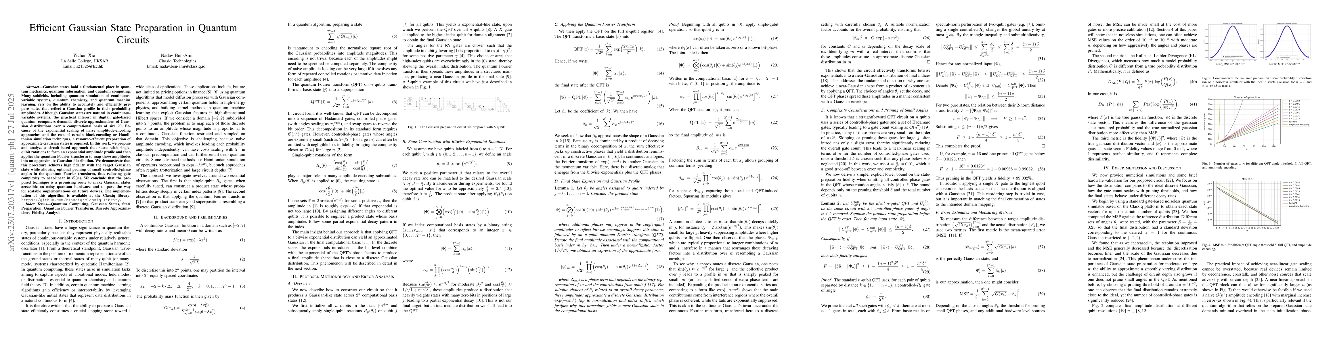 Gaussian states hold a fundamental place in quantum mechanics, quantum information, and quantum computing. Many subfields, including quantum simulation of continuous-variable systems, quantum chemistry, and quantum machine learning, rely on the ability to accurately and efficiently prepare states that reflect a Gaussian profile in their probability amplitudes. Although Gaussian states are natural in continuous-variable systems, the practical interest in digital, gate-based quantum computers demands discrete approximations of Gaussian distributions over a computational basis of size \(2^n\). Because of the exponential scaling of naive amplitude-encoding approaches and the cost of certain block-encoding or Hamiltonian simulation techniques, a resource-efficient preparation of approximate Gaussian states is required. In this work, we propose and analyze a circuit-based approach that starts with single-qubit rotations to form an exponential amplitude profile and then applies the quantum Fourier transform to map those amplitudes into an approximate Gaussian distribution. We demonstrate that this procedure achieves high fidelity with the target Gaussian state while allowing optional pruning of small controlled-phase angles in the quantum Fourier transform, thus reducing gate complexity to near-linear in \(\mathcal{O}(n)\). We conclude that the proposed technique is a promising route to make Gaussian states accessible on noisy quantum hardware and to pave the way for scalable implementations on future devices. The implementation of this algorithm is available at the Classiq library: https://github.com/classiq/classiq-library.