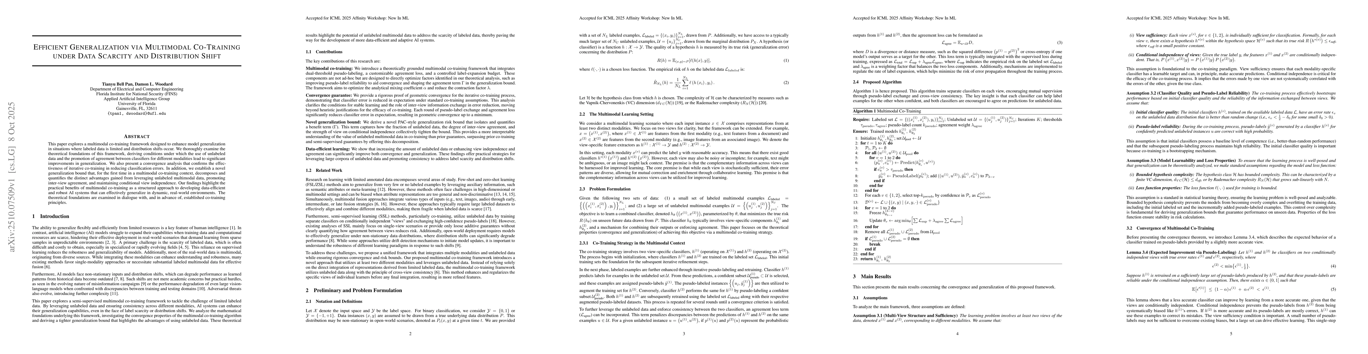 This work advances the understanding of co-training in multimodal settings, offering rigorous theoretical foundations for data-efficient learning. It enables robust generalization in dynamic environments, critical for real-world applications like misinformation detection and adaptive systems.