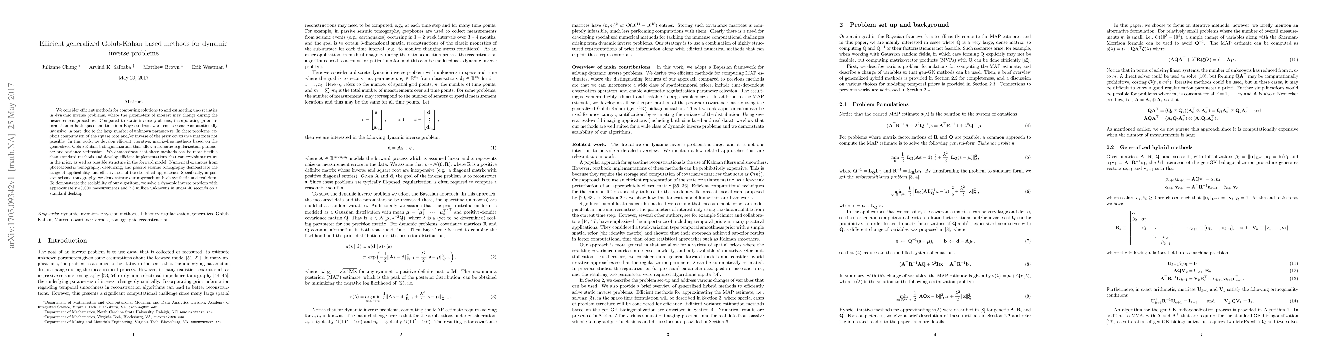 This paper develops efficient, iterative, matrix-free methods based on generalized Golub-Kahan bidiagonalization for dynamic inverse problems, enabling automatic regularization and variance estimation without explicit computation of large covariance matrices. The proposed methods are demonstrated to be scalable and effective across various applications, including photoacoustic tomography and passive seismic tomography.