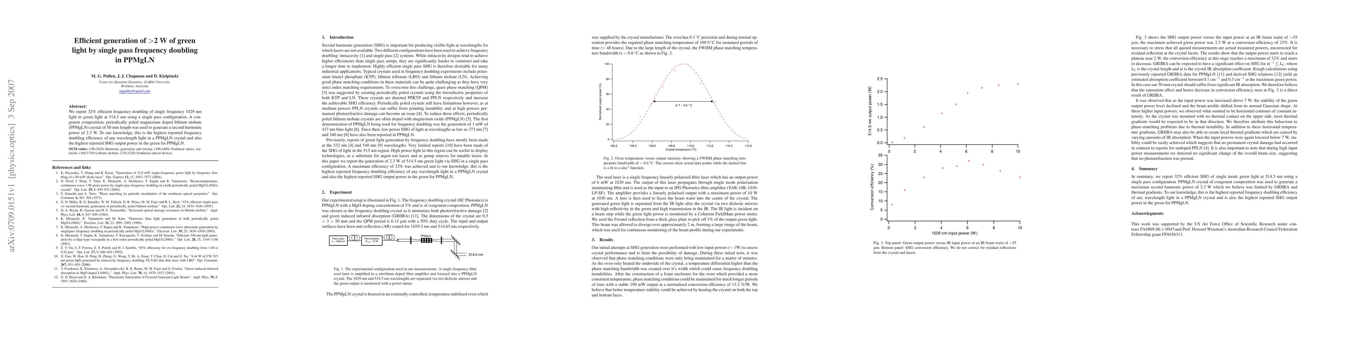 This paper reports a 32% efficient frequency doubling of 1029 nm light to 514.5 nm green light using a single pass configuration in a 50 mm long PPMgLN crystal, achieving a record-high output power of 2.3 W. This is the highest reported efficiency and output power for green light generation in PPMgLN.