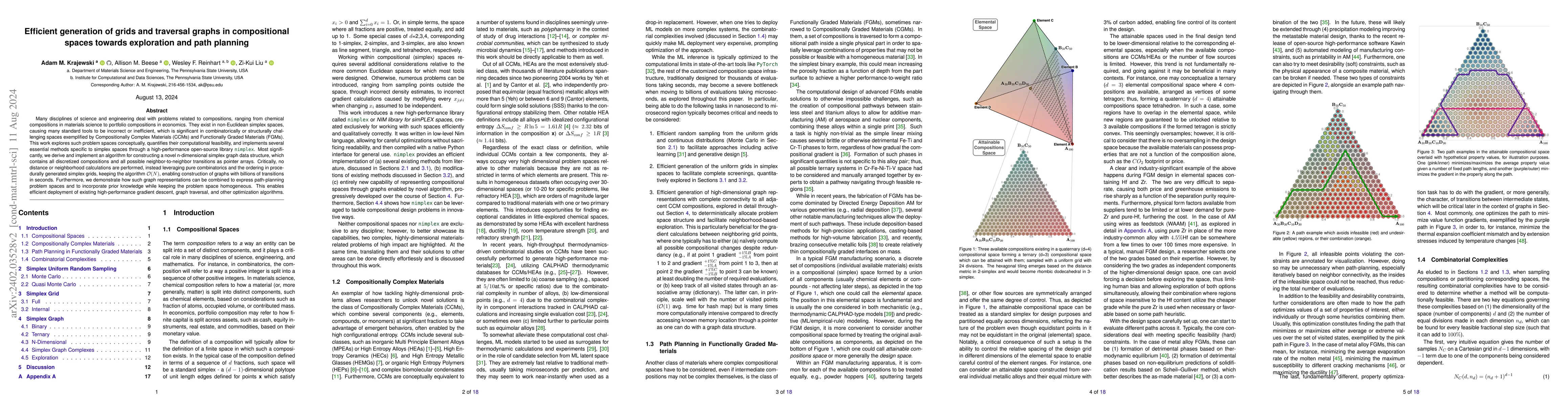 Many disciplines of science and engineering deal with problems related to compositions, ranging from chemical compositions in materials science to portfolio compositions in economics. They exist in non-Euclidean simplex spaces, causing many standard tools to be incorrect or inefficient, which is significant in combinatorically or structurally challenging spaces exemplified by Compositionally Complex Materials (CCMs) and Functionally Graded Materials (FGMs). Here, we explore them conceptually in terms of problem spaces and quantitatively in terms of computational feasibility. This work implements several essential methods specific to the compositional (simplex) spaces through a high-performance open-source library nimplex. Most significantly, we derive and implement an algorithm for constructing a novel n-dimensional simplex graph data structure, which contains all discretized compositions and all possible neighbor-to-neighbor transitions as pointer arrays. Critically, no distance or neighborhood calculations are performed, instead leveraging pure combinatorics and the ordering in procedurally generated simplex grids, keeping the algorithm $\mathcal{O}(N)$, so that graphs with billions of transitions take seconds to construct on a laptop. Furthermore, we demonstrate how such graph representations can be combined to express path-planning problem spaces and to incorporate prior knowledge while keeping the problem space homogeneous. This allows for efficient deployment of existing high-performance gradient descent, graph traversal search, and other path optimization algorithms.